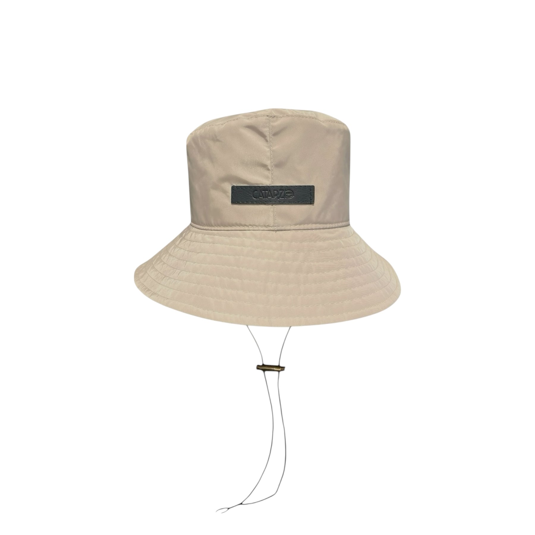 Nylon bucket hat with elastic slider chin strap and leather logo. Interior drawstring for size adjustment.