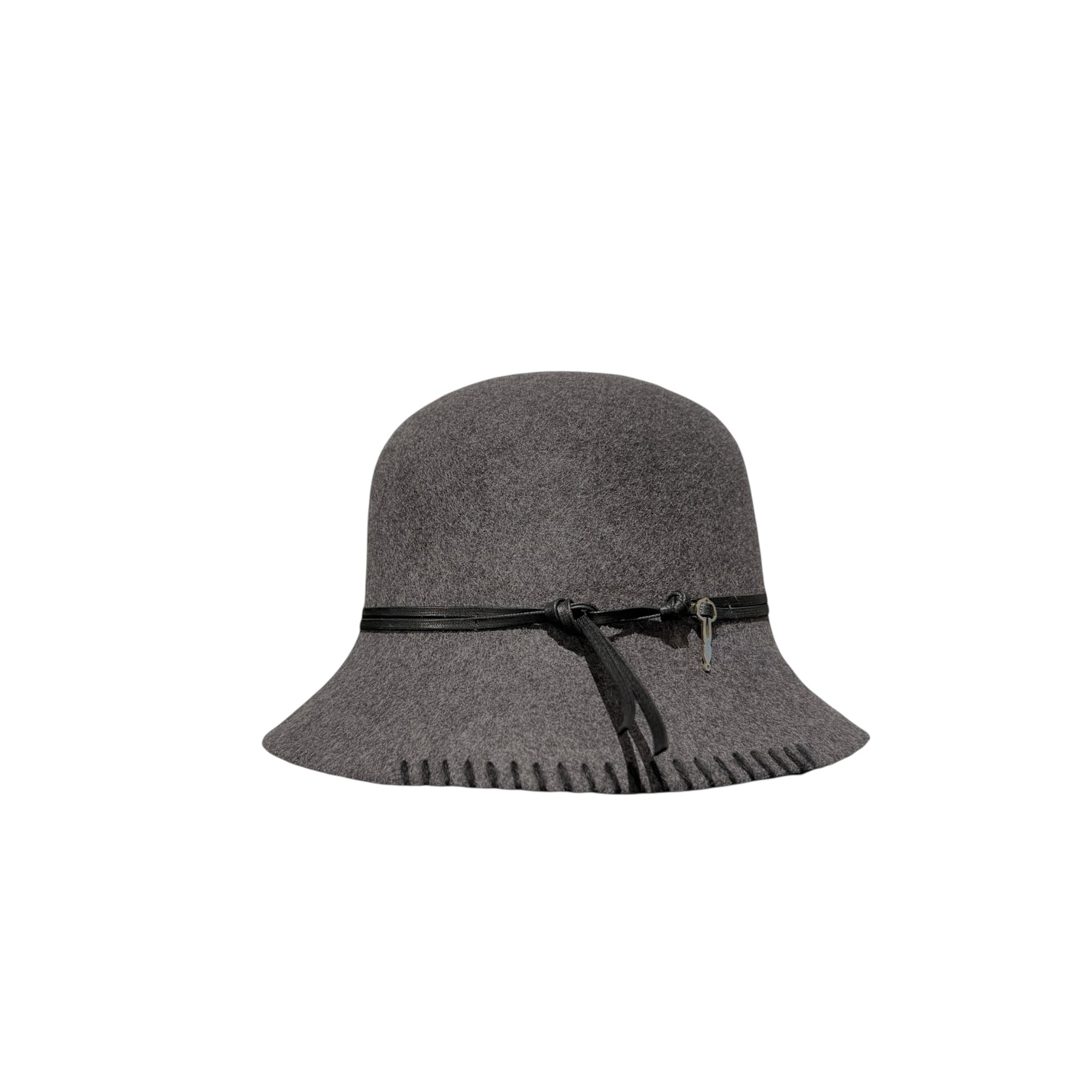 Melange wool felt cloche with suede cord hat band and metal scissors logo. Partial whip stitching at brim, interior drawstring for size adjustment.