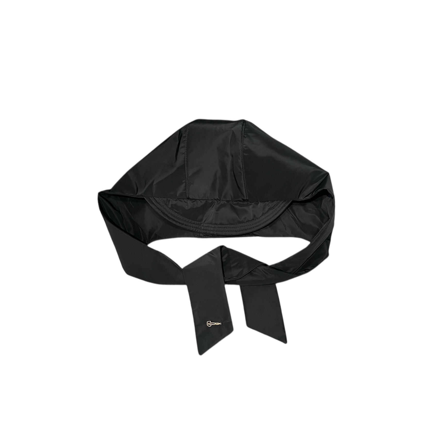 Reversible hood with brim and leather logo. Ties at neck.