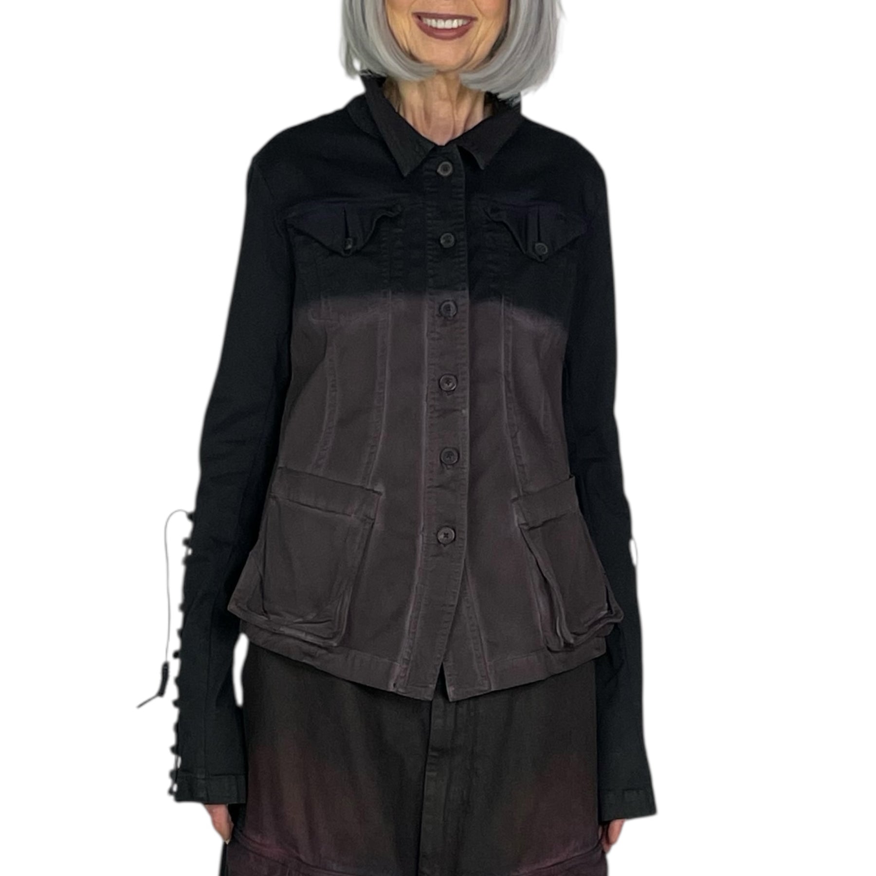 Dip-dyed shaped jacket with a small collar and button front closure. Long sleeves with leather cord lacing. Two breast flap button pockets, two front gusseted patch pockets.