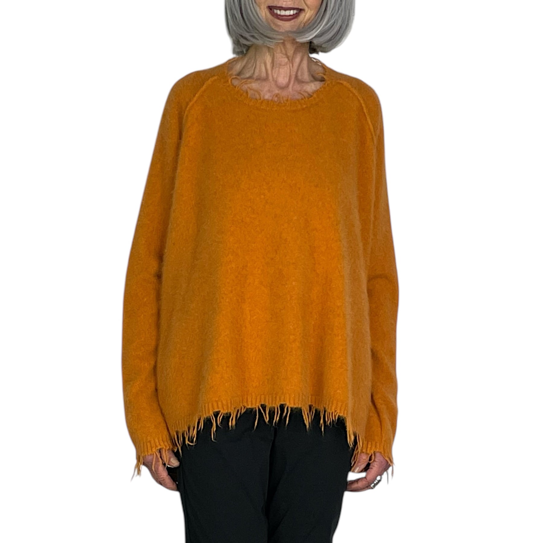 Crewneck sweater with raglan long sleeves and a wide silhouette. Ribbing with fringed edges at neckline, cuffs and hem.