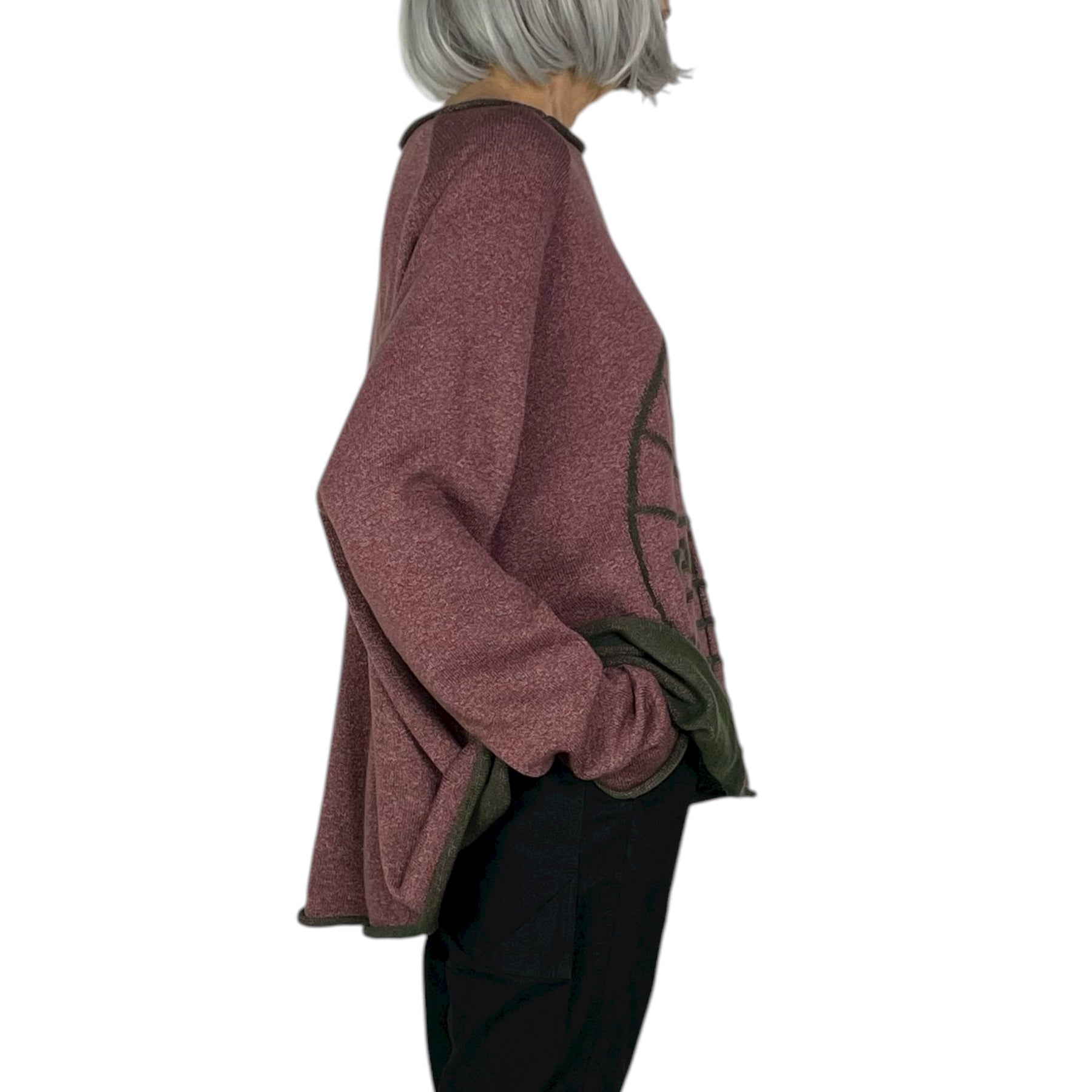 Jacquard knit pullover sweater with a round neckline and raglan long sleeves.  Wide silhouette.