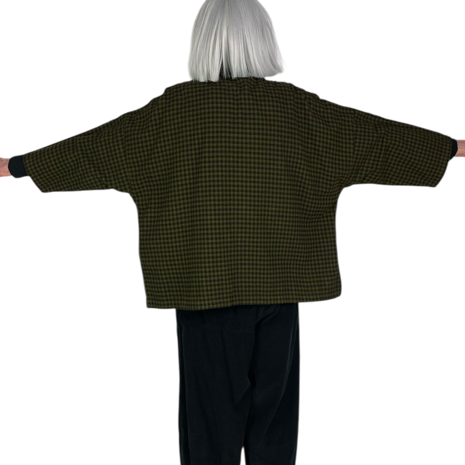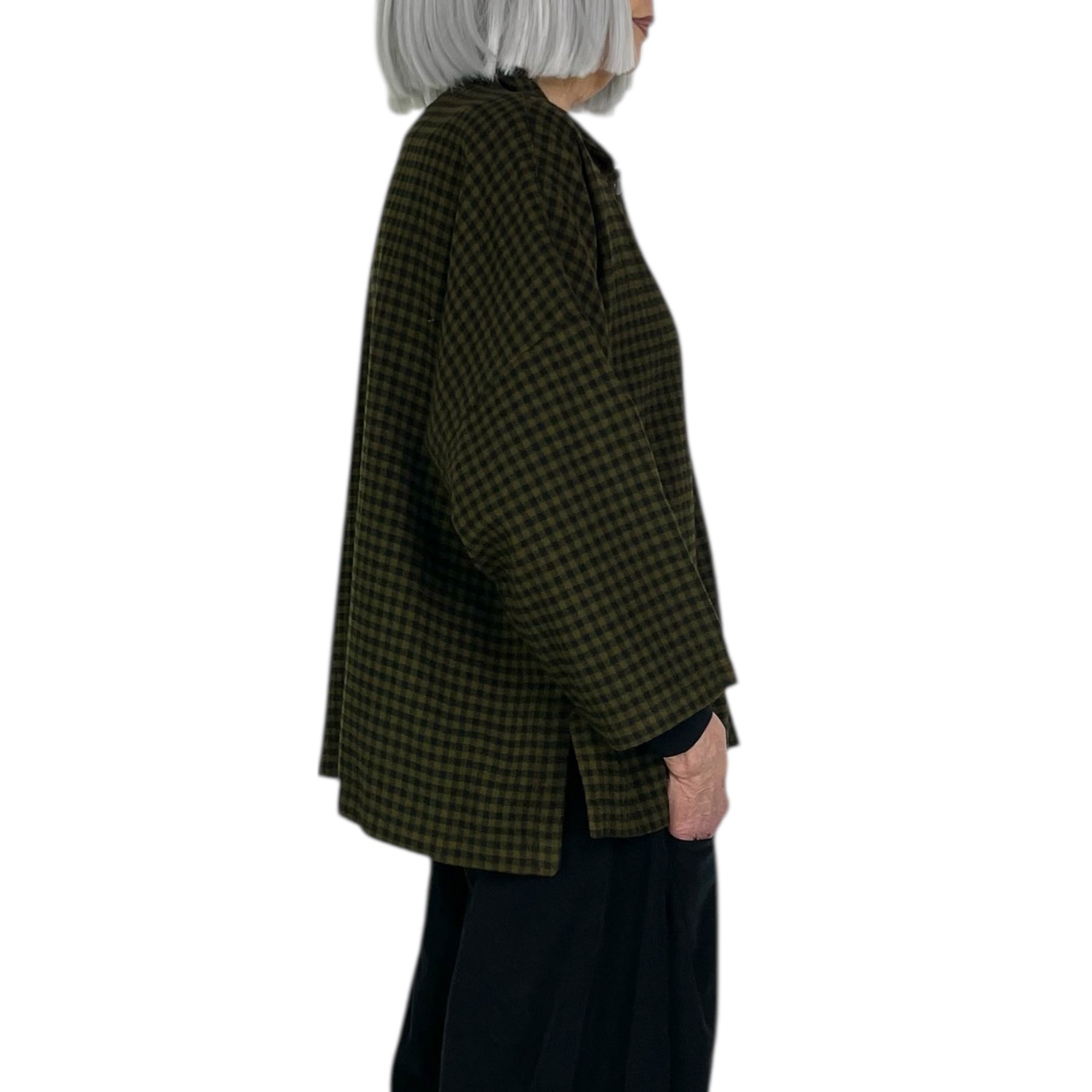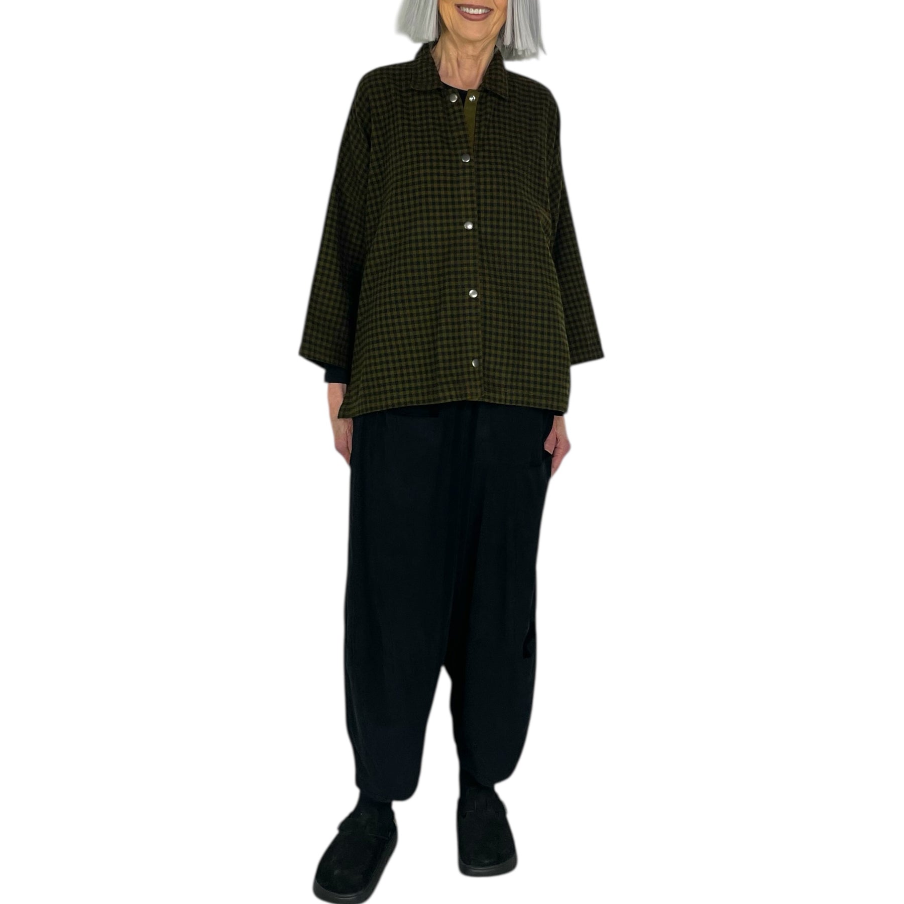 Cotton flannel snap front shirt with bracelet length sleeves. Boxy cut, drop shoulders, and side slits.