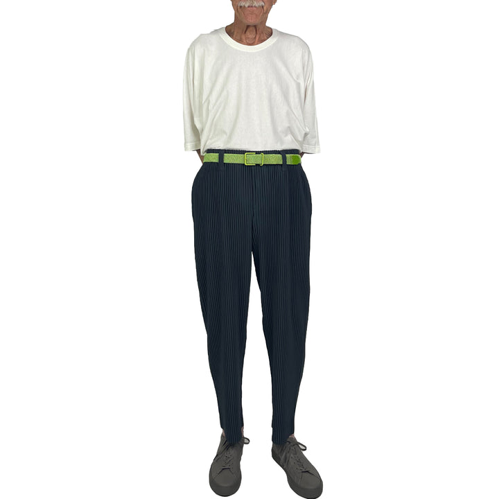 1.25" stretch woven rayon belt with rectangle metal buckle. Tip has been dipped in resin to prevent fraying