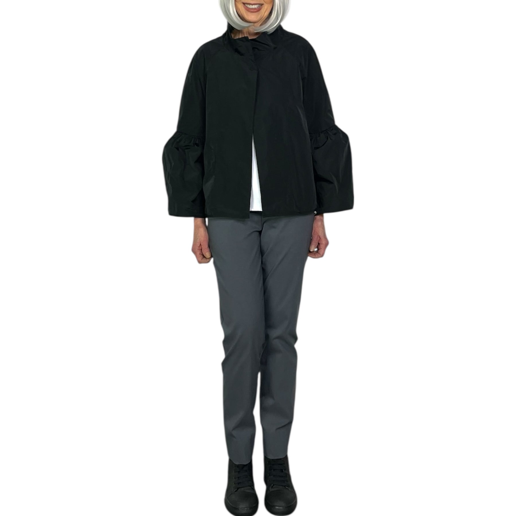 Stand collar cropped jacket with a snap front closure and two front pockets. Gathered bell sleeves.