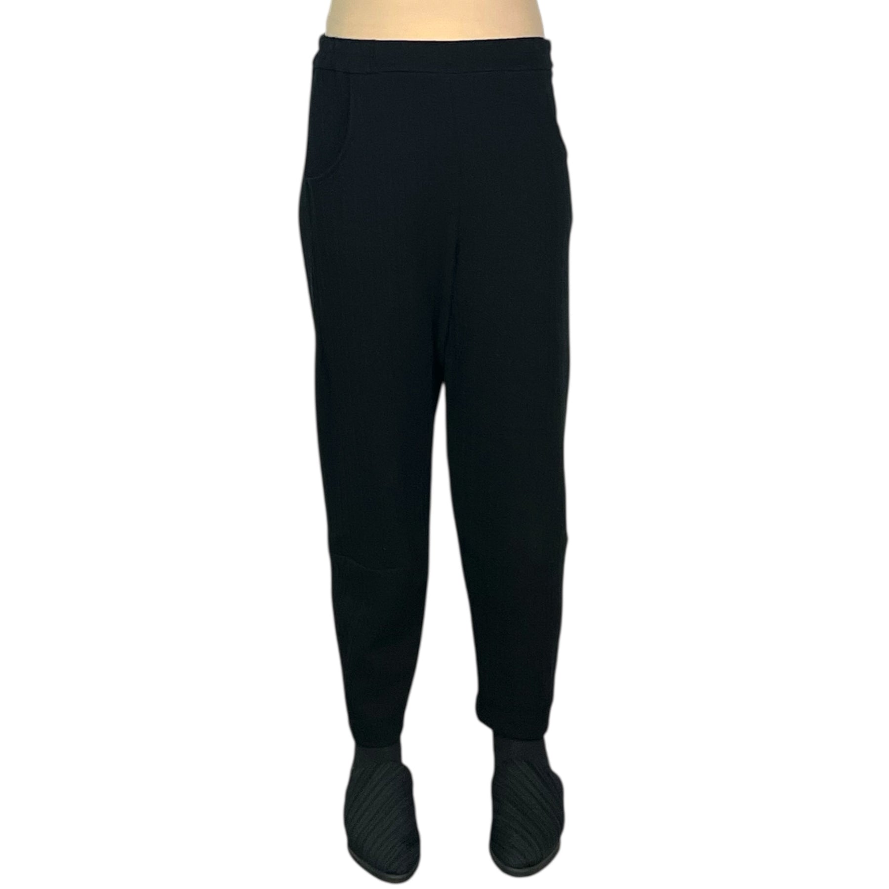 Textured stripe pant with elasticized waistband and two side pockets. Curved slim leg.