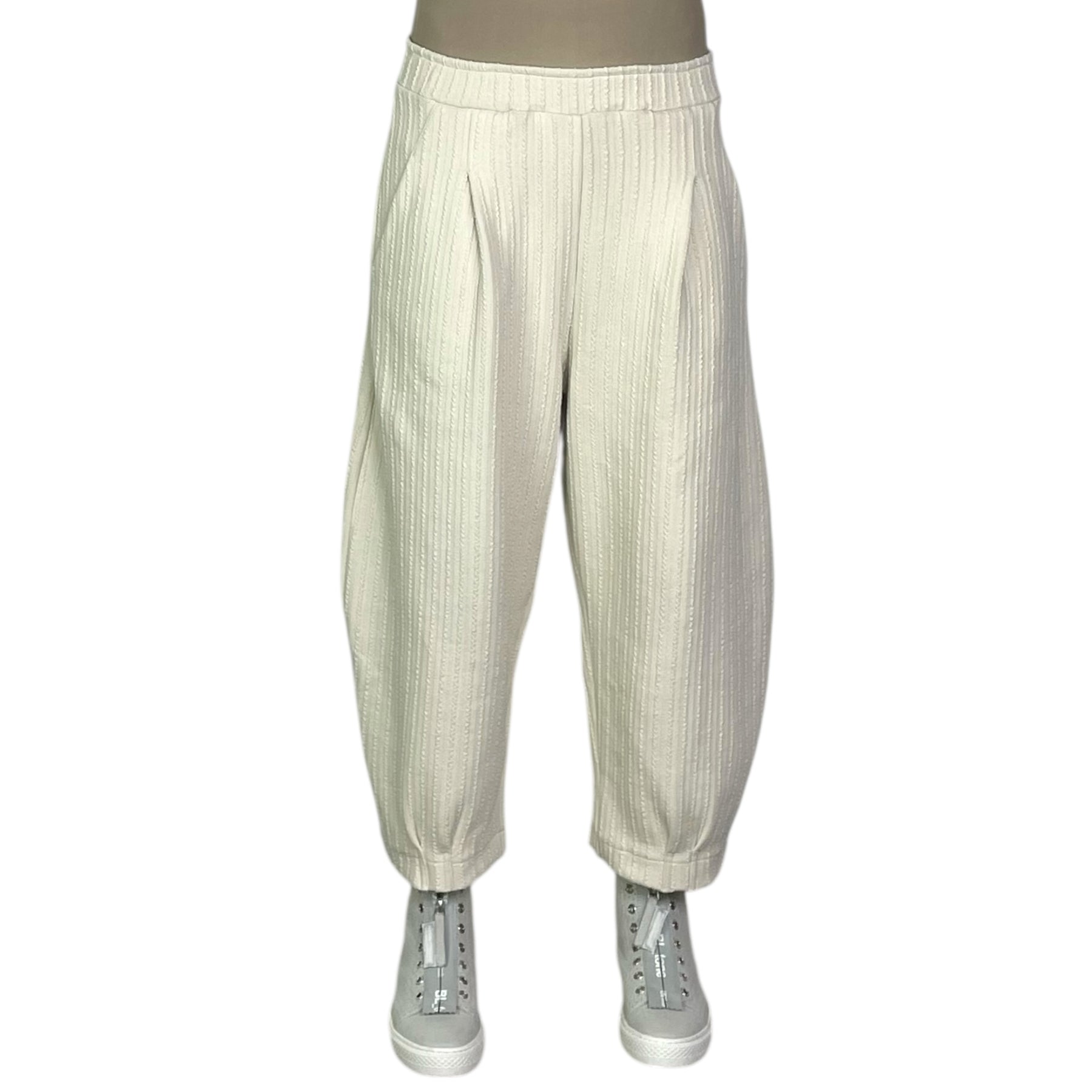 Knit textured stripe pant with elasticized waistband and two side slit pockets. Stitched down pleats at waist and hem, curve shaped legs.