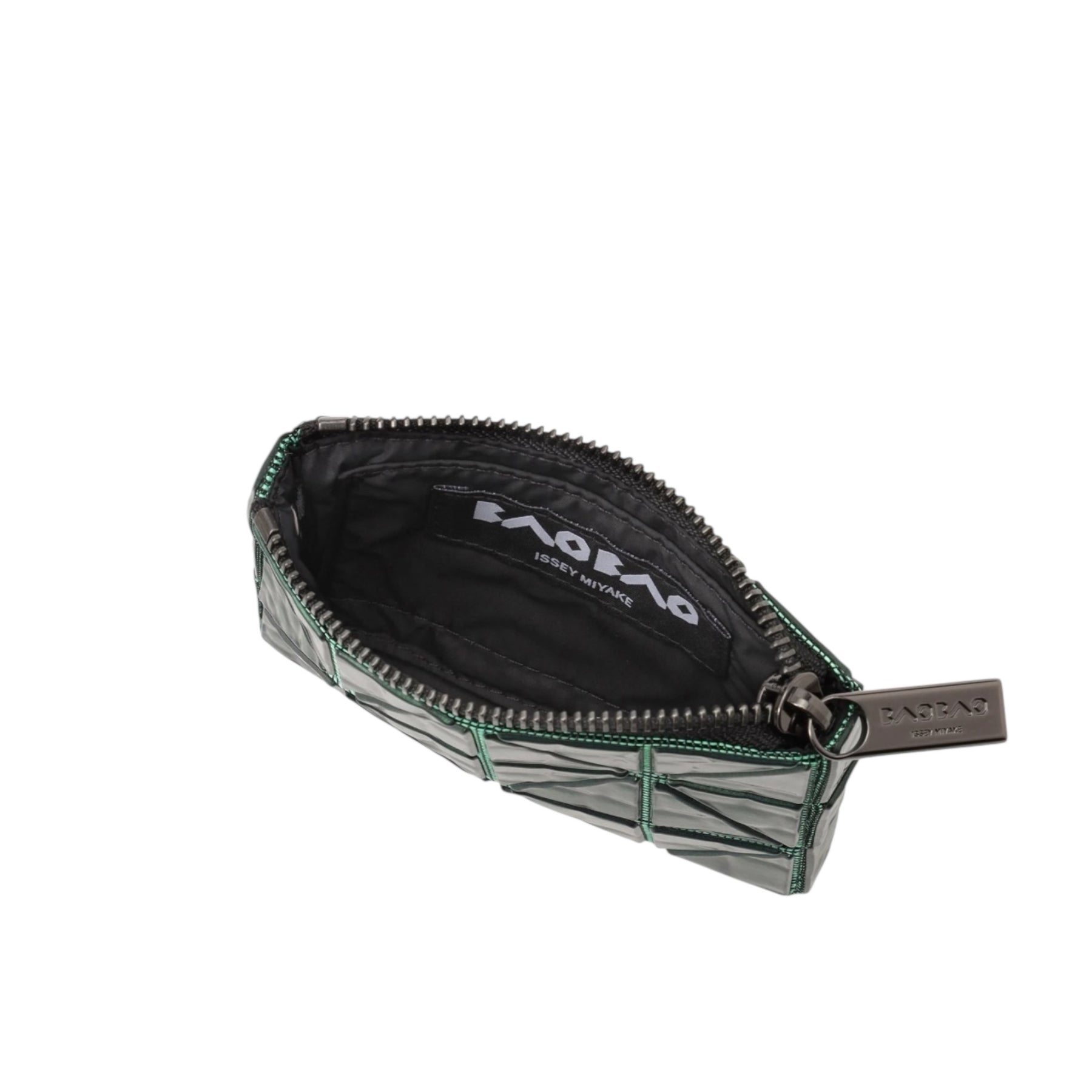 Small zip top pouch with an interior pocket and ring to attach a keychain. Fully lined.