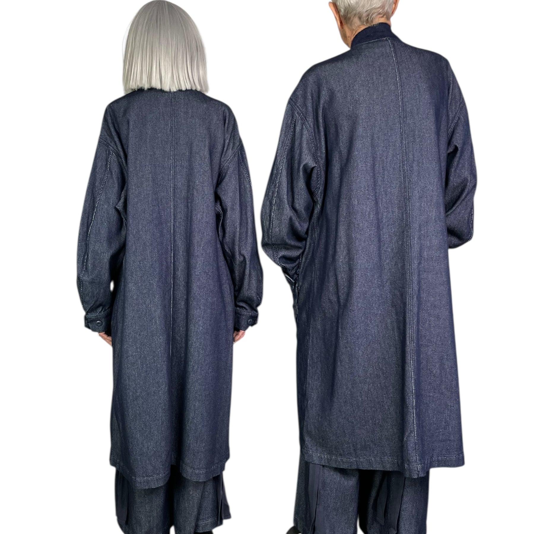 Unisex long sleeve collarless jacket with button closure at contrast trim. Four front flap pockets. Button cuffs for adjustment.
