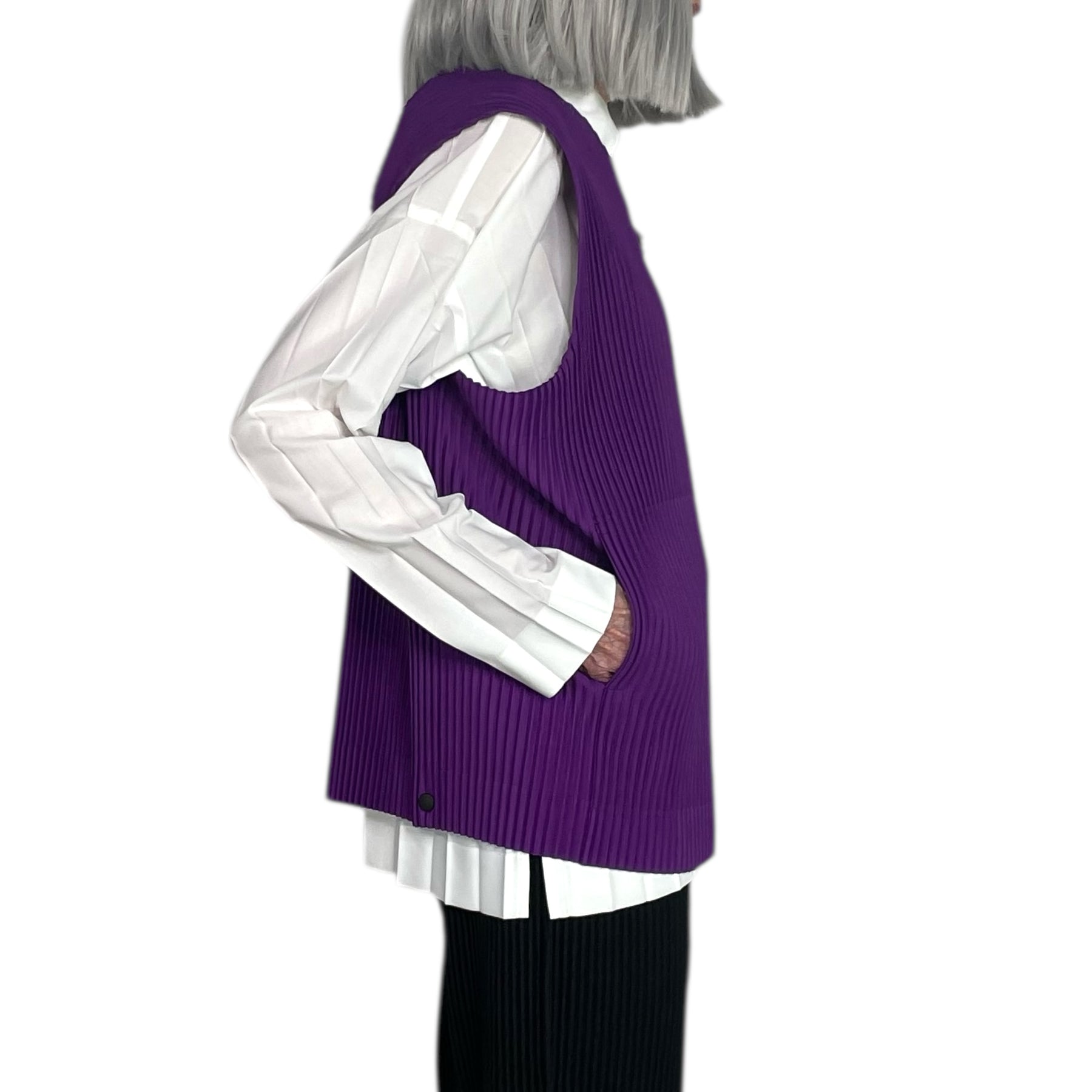 Unisex pleated vest with snap closures at sides and shoulders.  Single pocket on the right side. Can be worn a variety of ways by overlapping and snapping the parts.