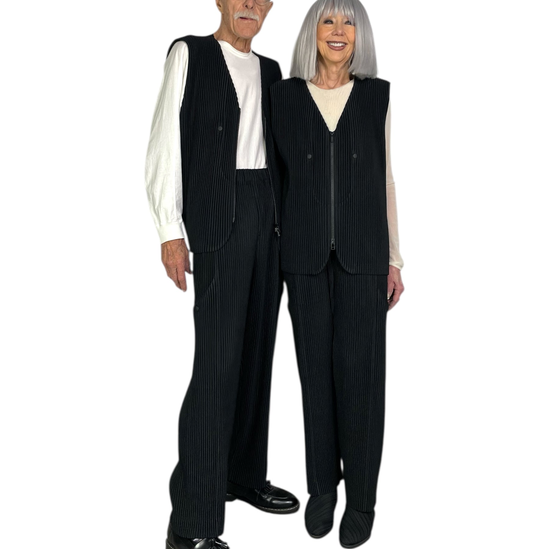 Unisex pleated V-neck vest with 2-way zip front closure. Two side entry chest pockets and two side pockets, all with snaps for security.