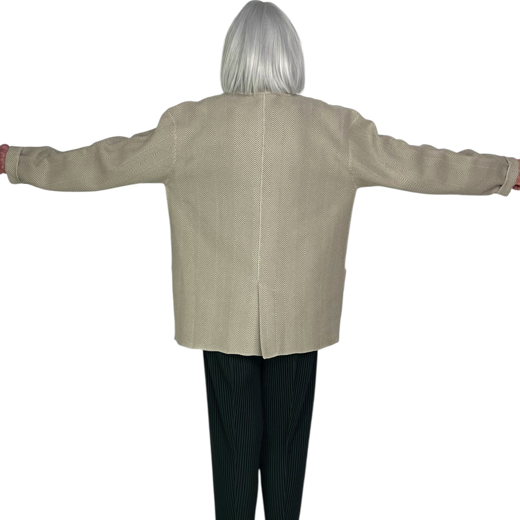 Unisex herringbone knit jacket with long sleeves and a single button closure. Notch collar, two front patch pockets and back center vent.
