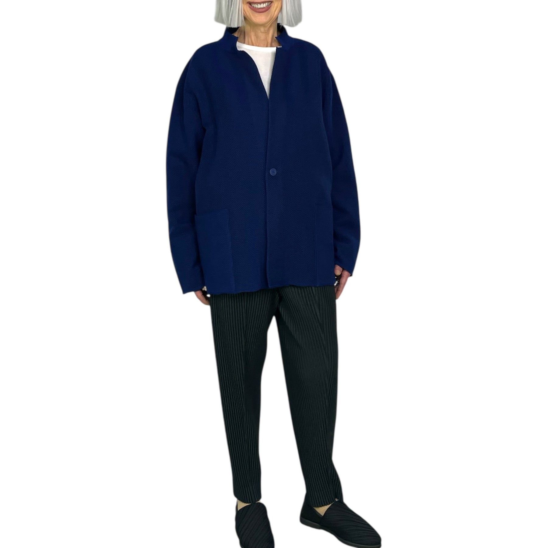 Unisex herringbone knit jacket with long sleeves and a single button closure.  Notch collar, two front patch pockets and back center vent.