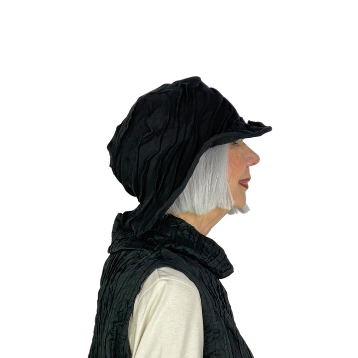 Twisted and tucked linen hat with wired brim for flexible shaping.