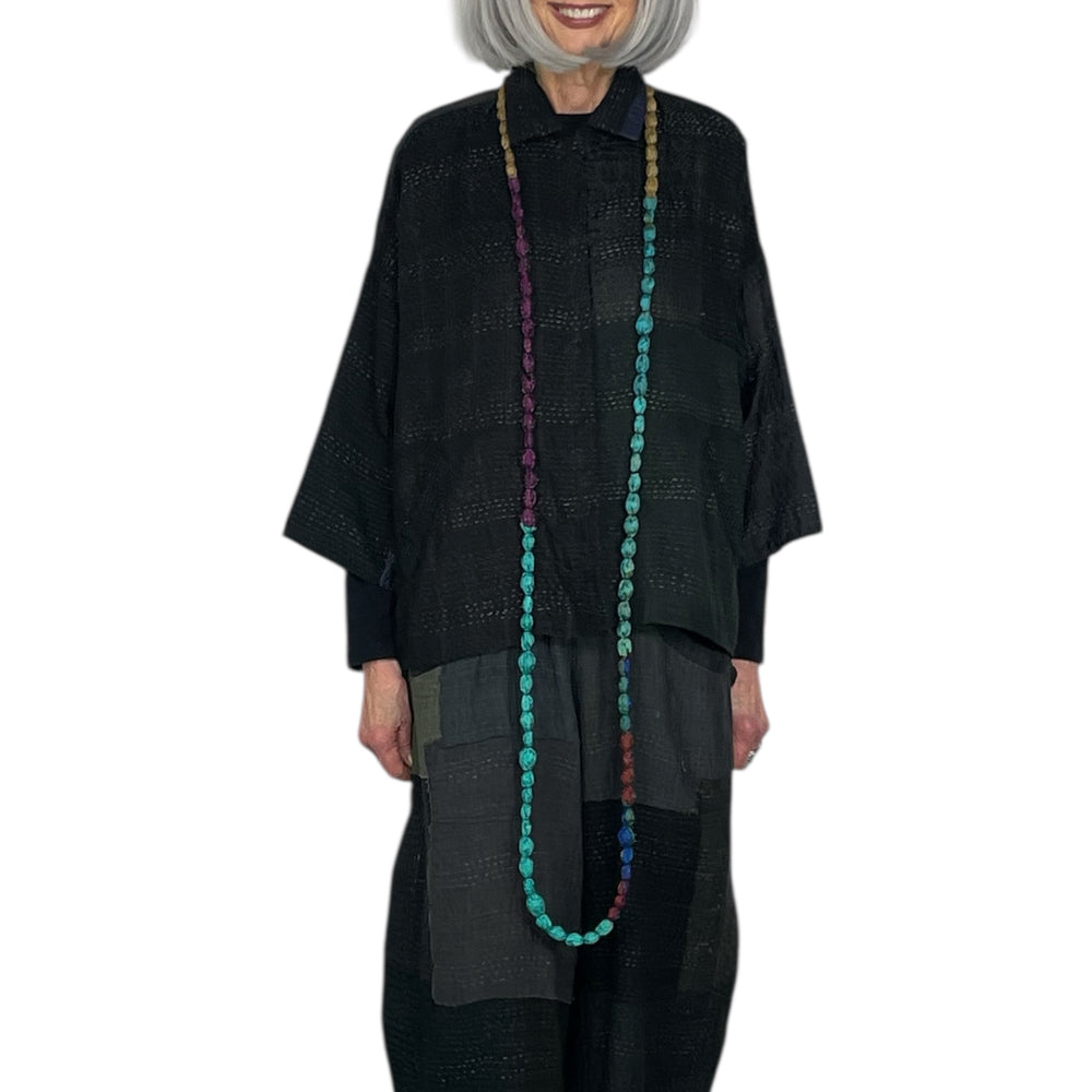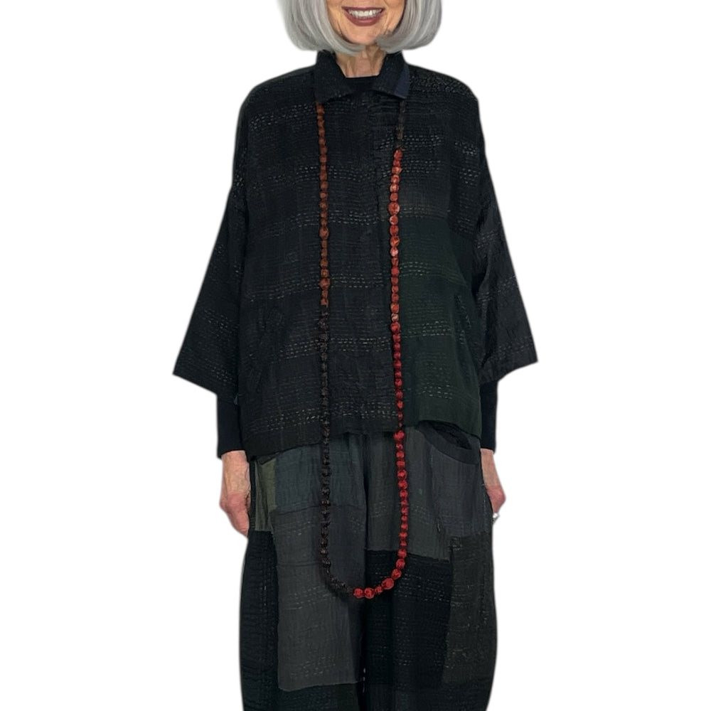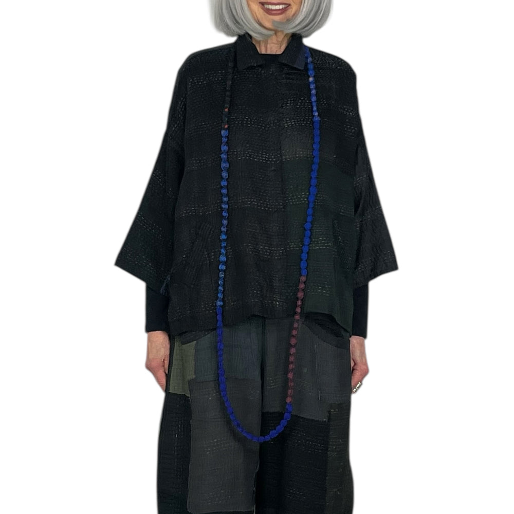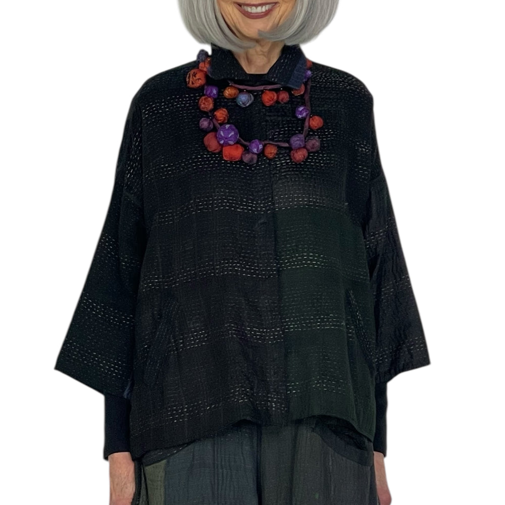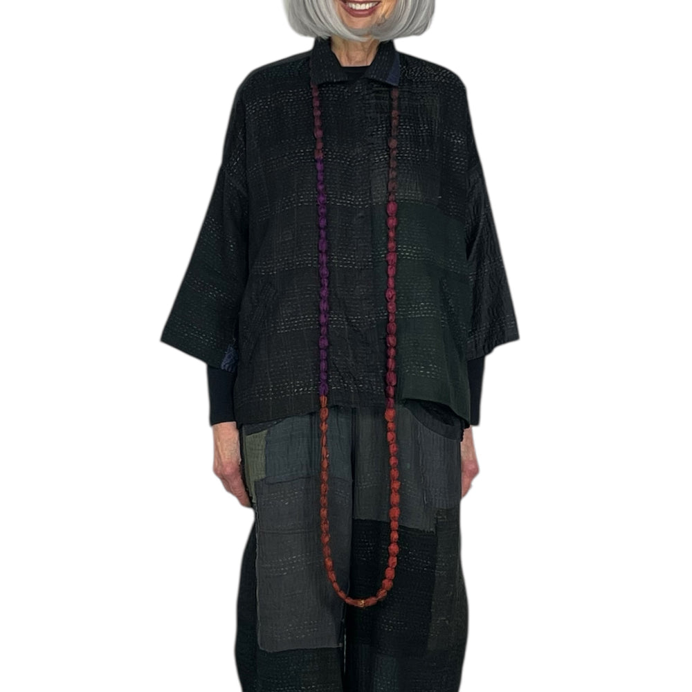 Japanese designer Mieko Mintz utilizes traditional Kantha fabric which are layers of vintage throws and saris joined together by a hand embroidered running stitch. Utilizing the kantha to create kimono jackets and other easy fit garments, Mieko merges the Indian and Japanese cultures into a contemporary and sophisticated line of clothing that envelops the wearer with sensuous comfort. In an effort towards zero waste, leftover fabric is up cycled to make hats, bags, scarves and jewelry.