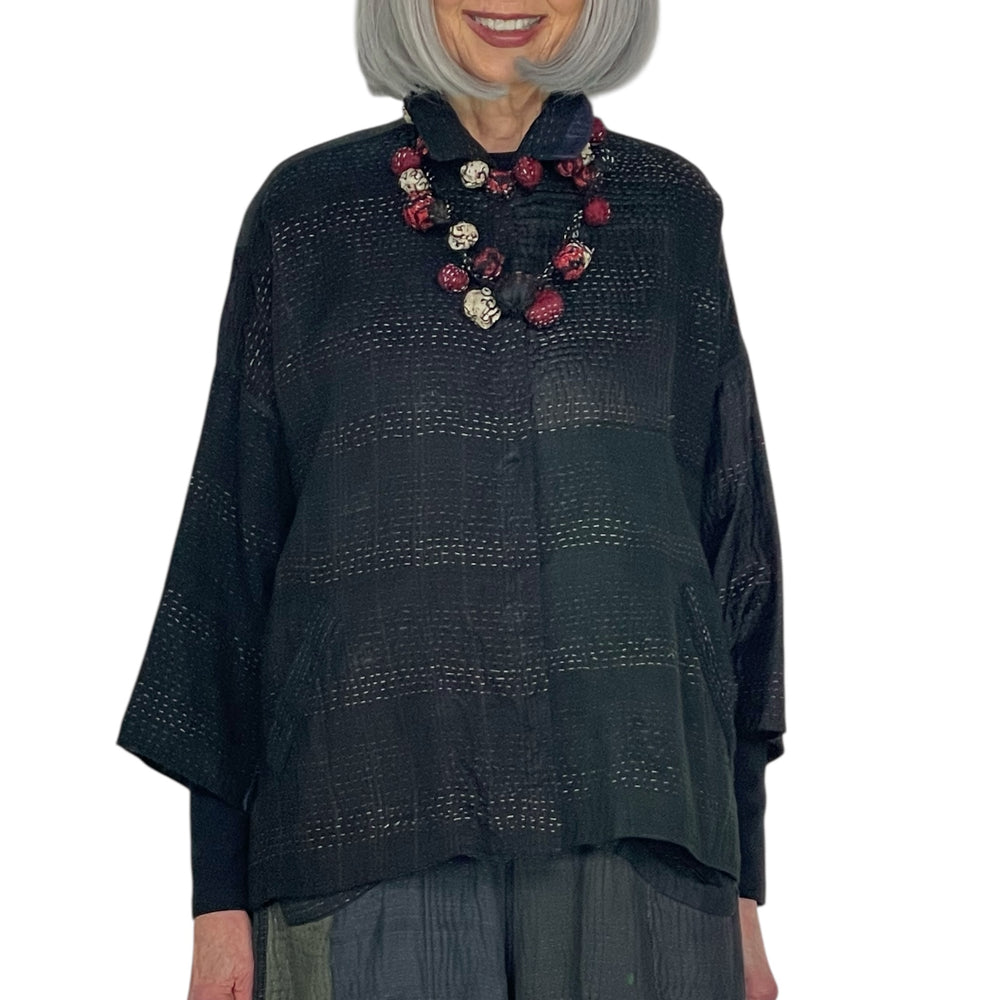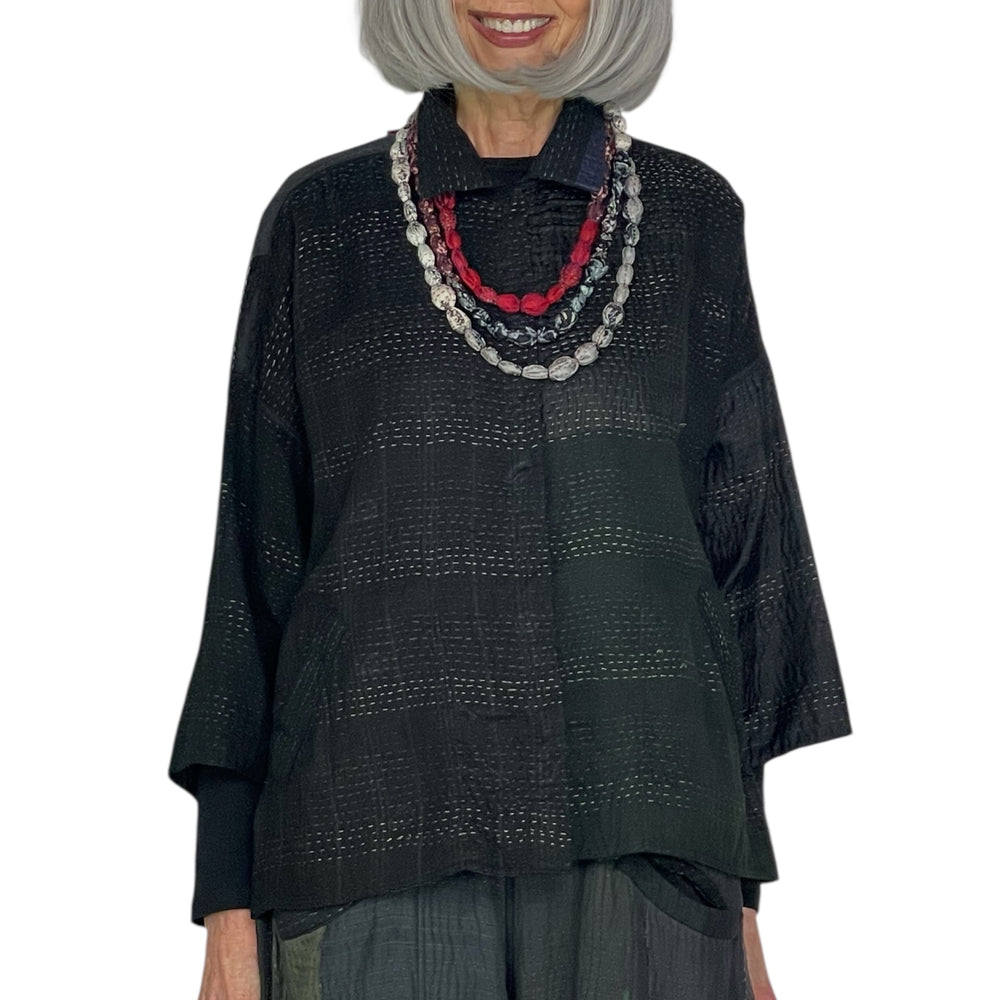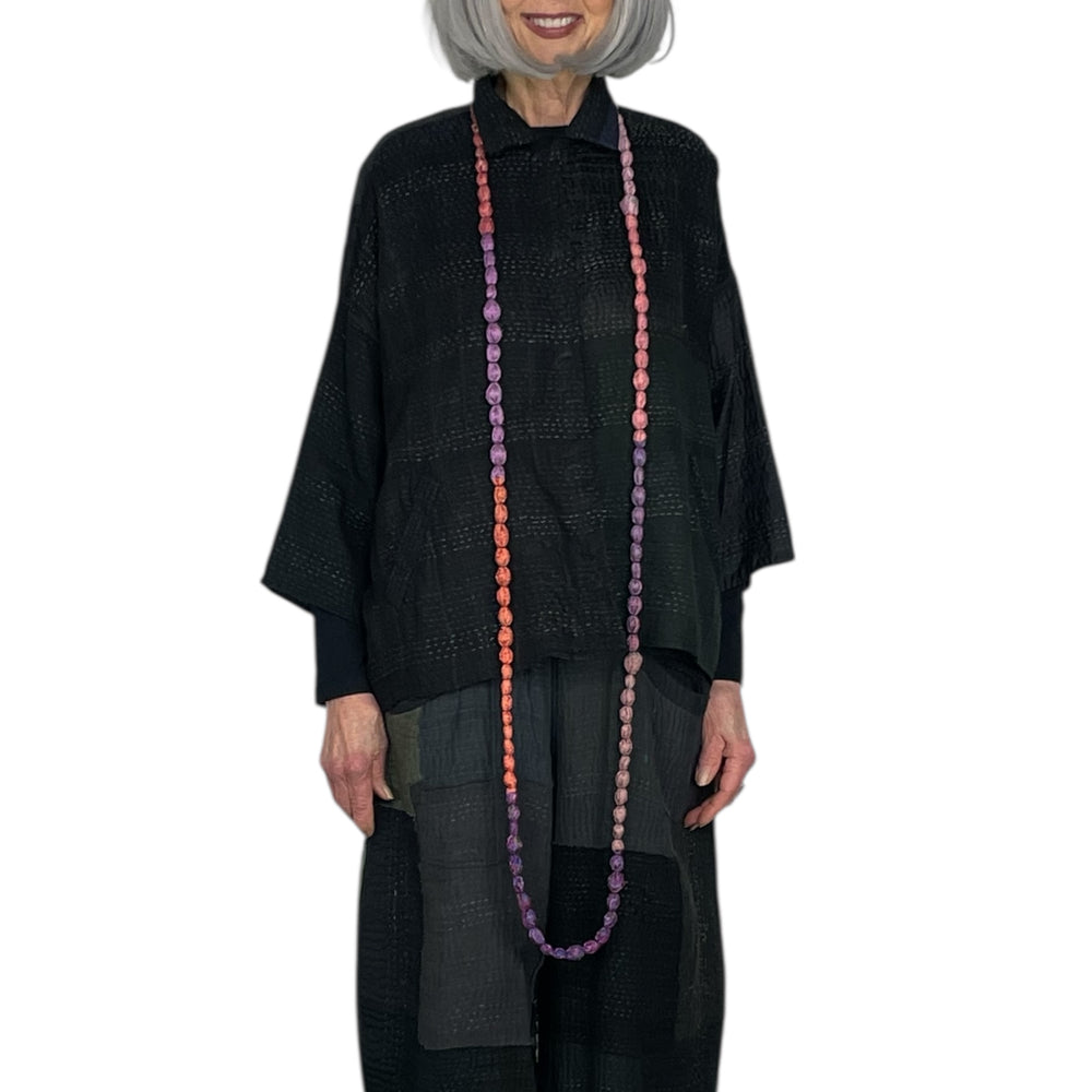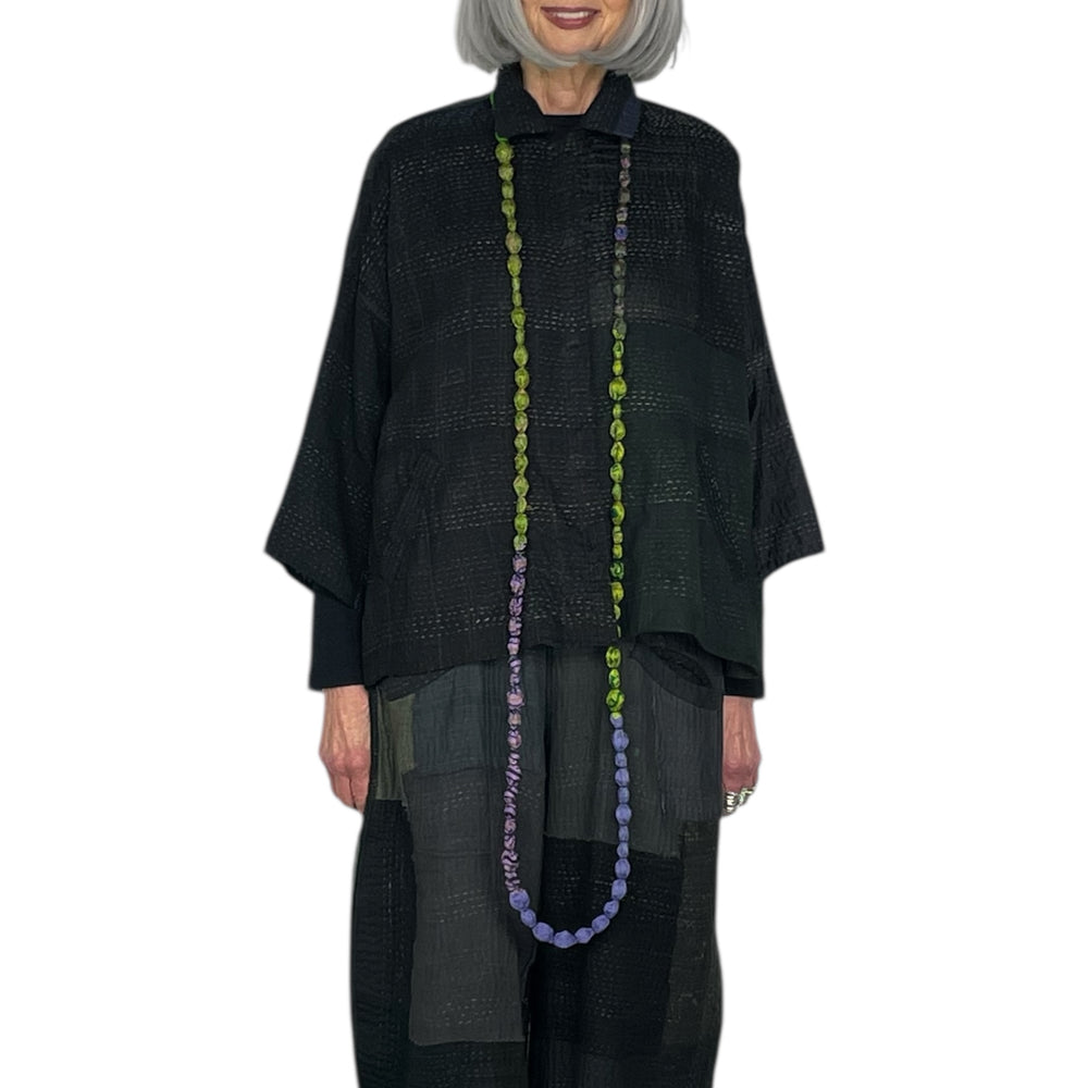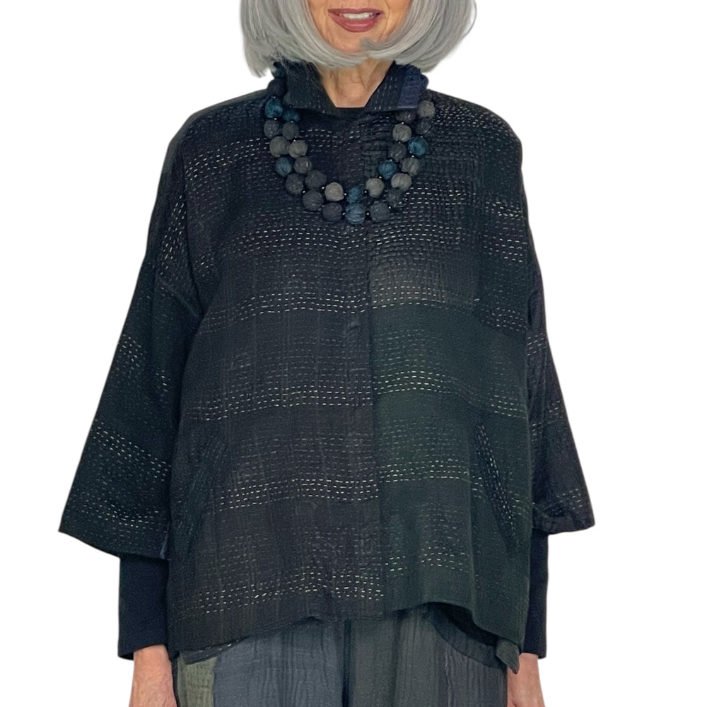Japanese designer Mieko Mintz utilizes traditional Kantha fabric which are layers of vintage throws and saris joined together by a hand embroidered running stitch. Utilizing the kantha to create kimono jackets and other easy fit garments, Mieko merges the Indian and Japanese cultures into a contemporary and sophisticated line of clothing that envelops the wearer with sensuous comfort. In an effort towards zero waste, leftover fabric is up cycled to make hats, bags, scarves and jewelry.