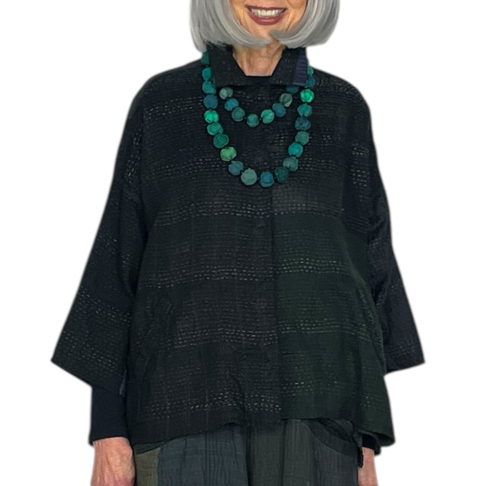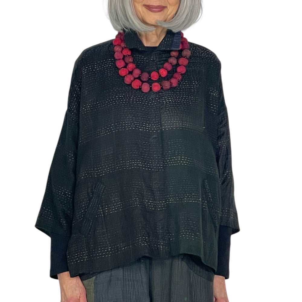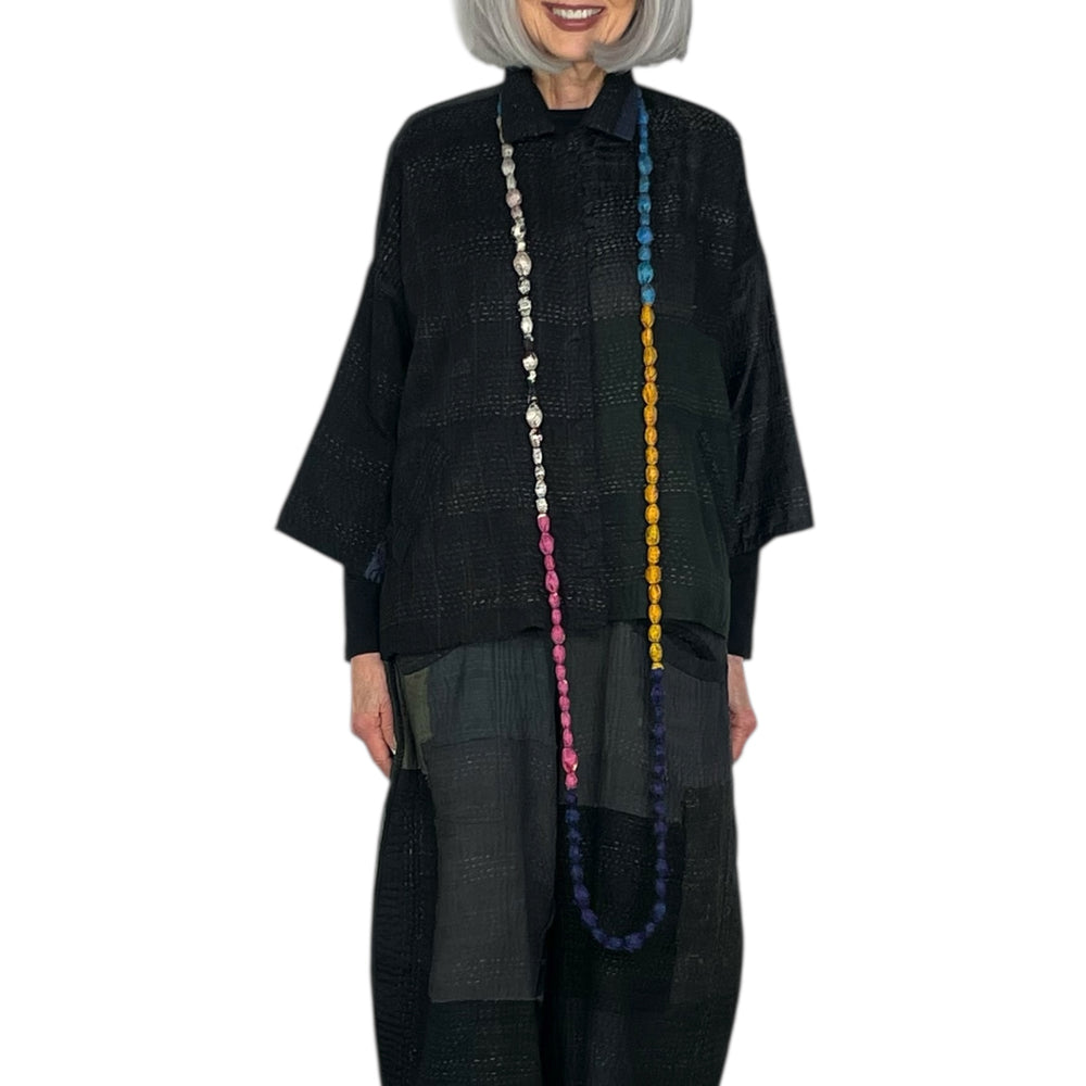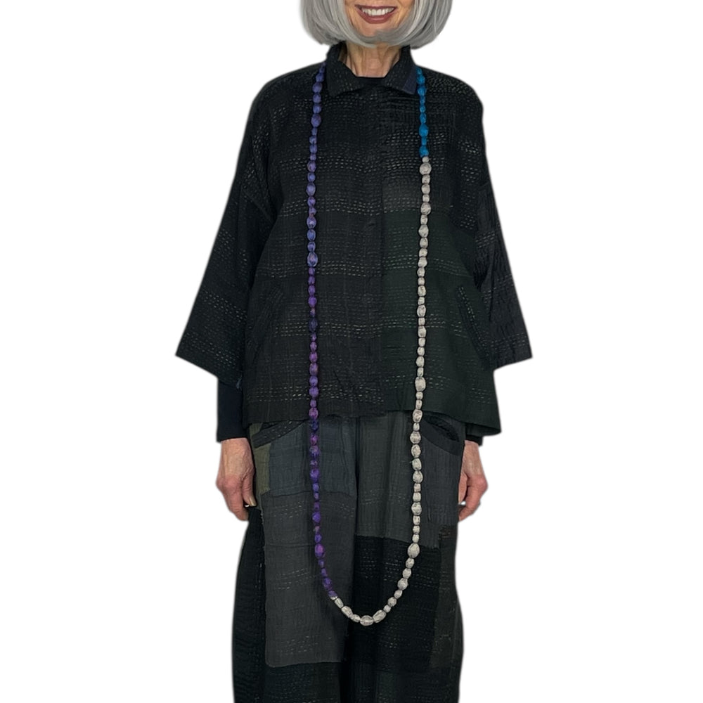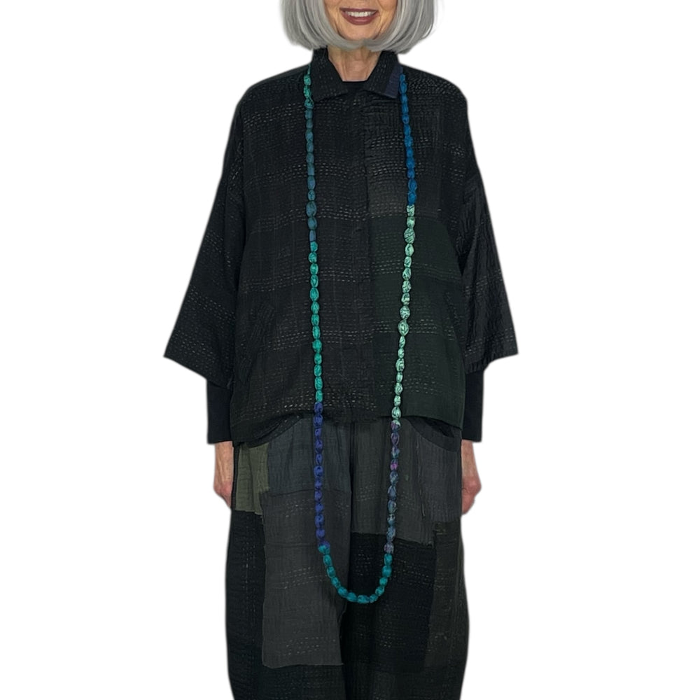 Japanese designer Mieko Mintz utilizes traditional Kantha fabric which are layers of vintage throws and saris joined together by a hand embroidered running stitch. Utilizing the kantha to create kimono jackets and other easy fit garments, Mieko merges the Indian and Japanese cultures into a contemporary and sophisticated line of clothing that envelops the wearer with sensuous comfort. In an effort towards zero waste, leftover fabric is up cycled to make hats, bags, scarves and jewelry.