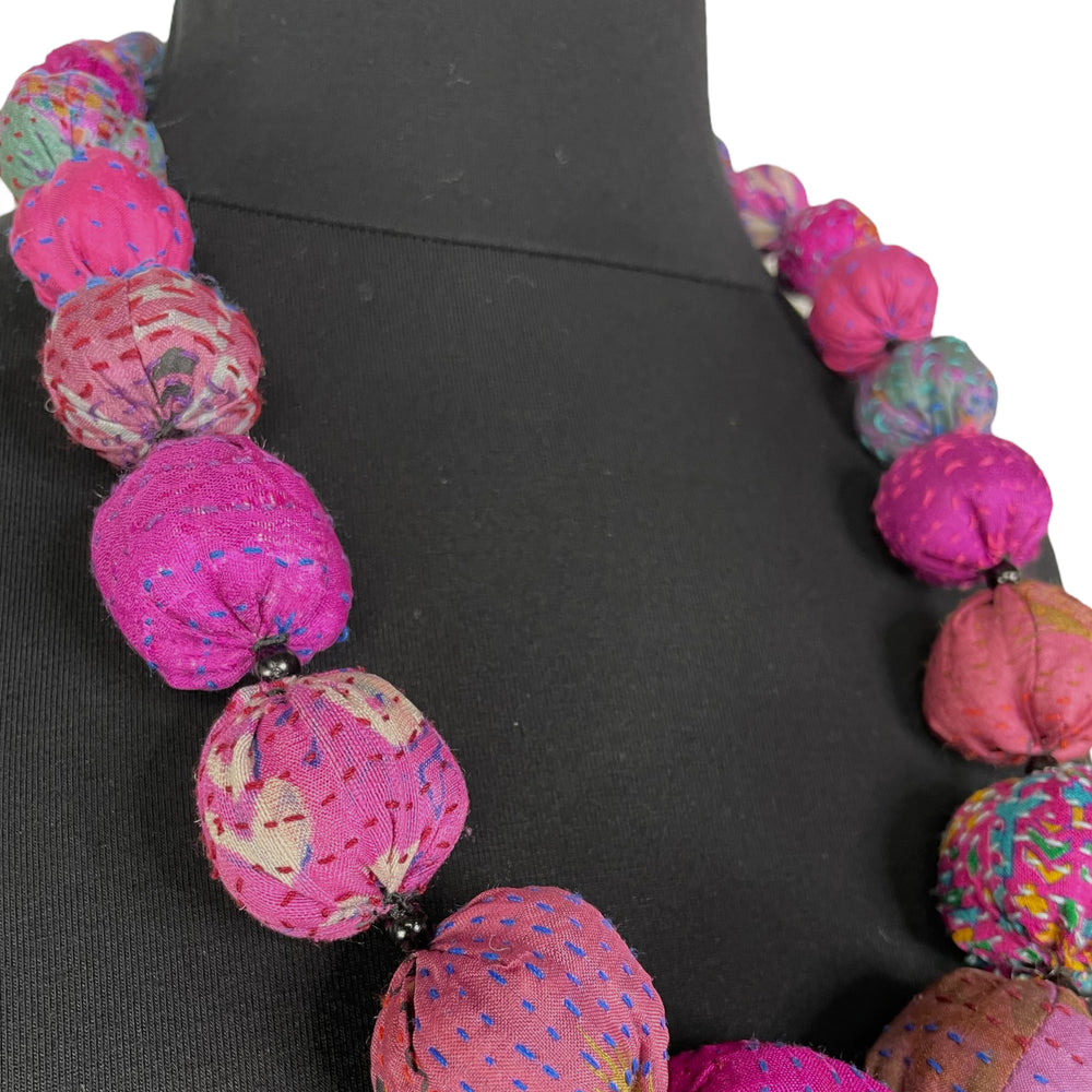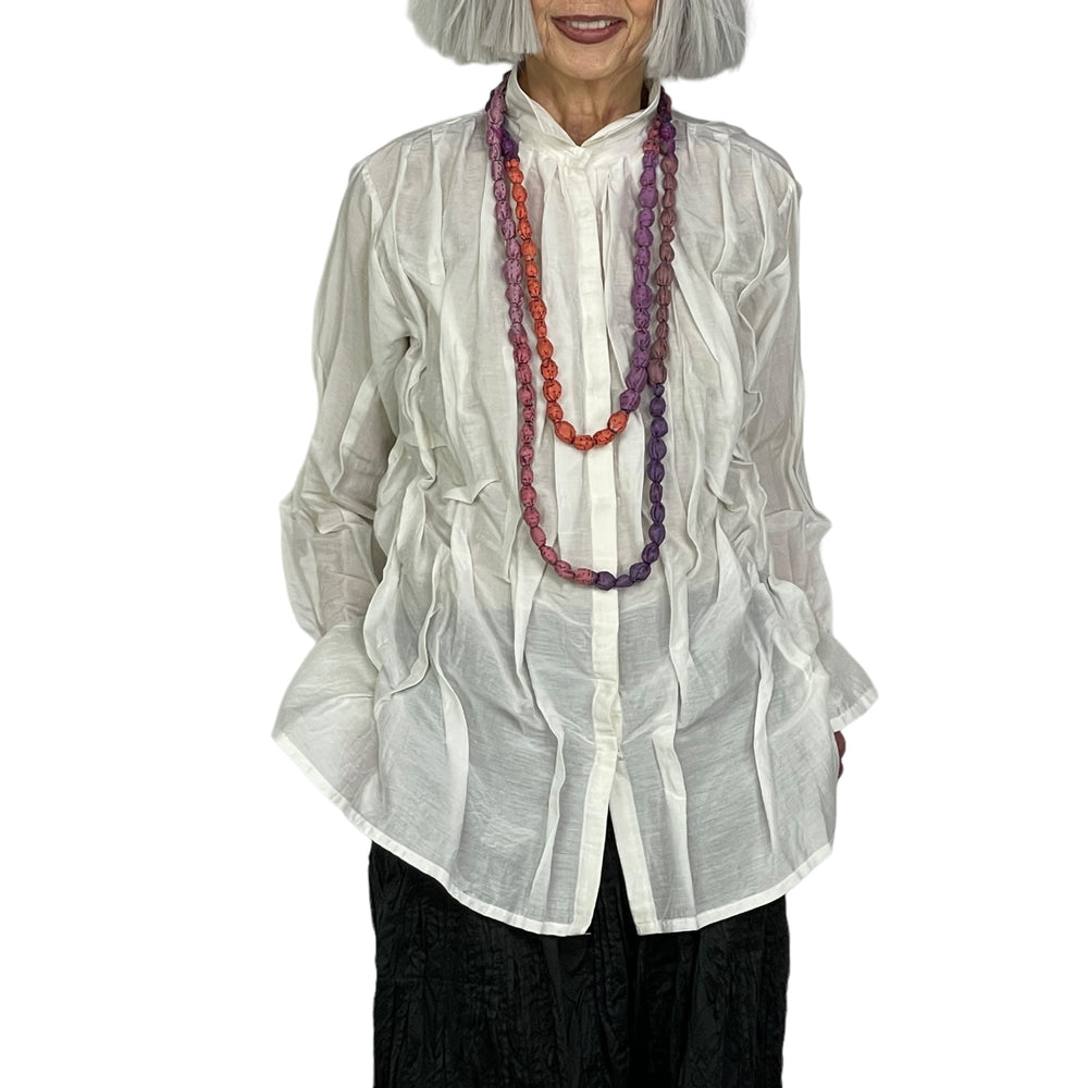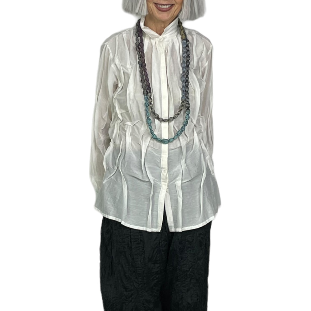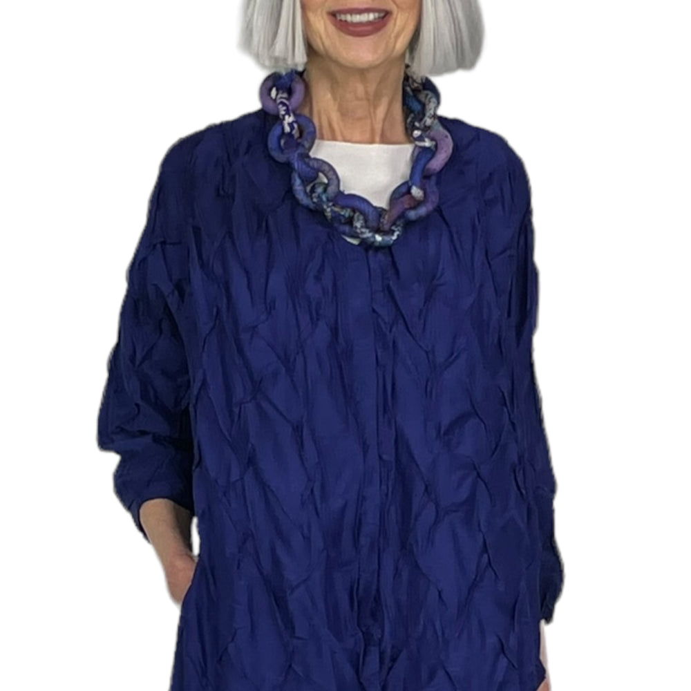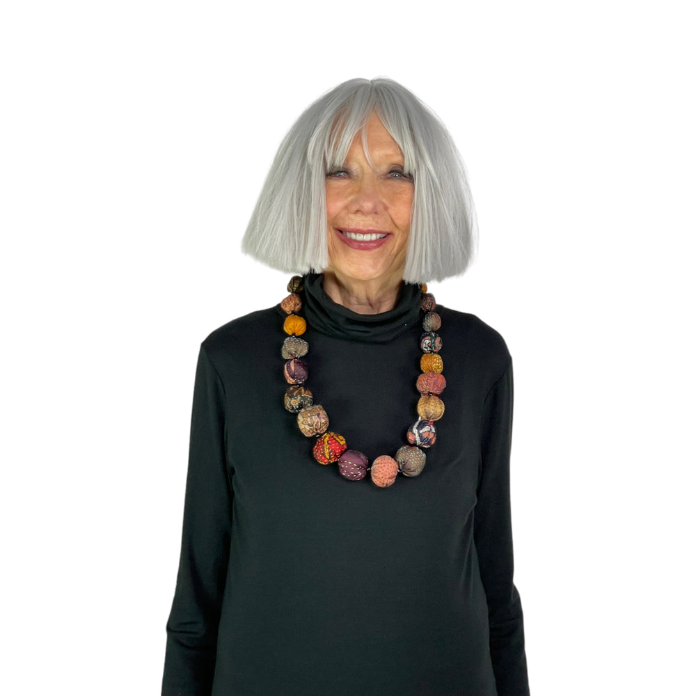 Japanese designer Mieko Mintz utilizes traditional Kantha fabric which are layers of vintage throws and saris joined together by a hand embroidered running stitch. Utilizing the kantha to create kimono jackets and other easy fit garments, Mieko merges the Indian and Japanese cultures into a contemporary and sophisticated line of clothing that envelops the wearer with sensuous comfort. In an effort towards zero waste, leftover fabric is up cycled to make hats, bags, scarves and jewelry.