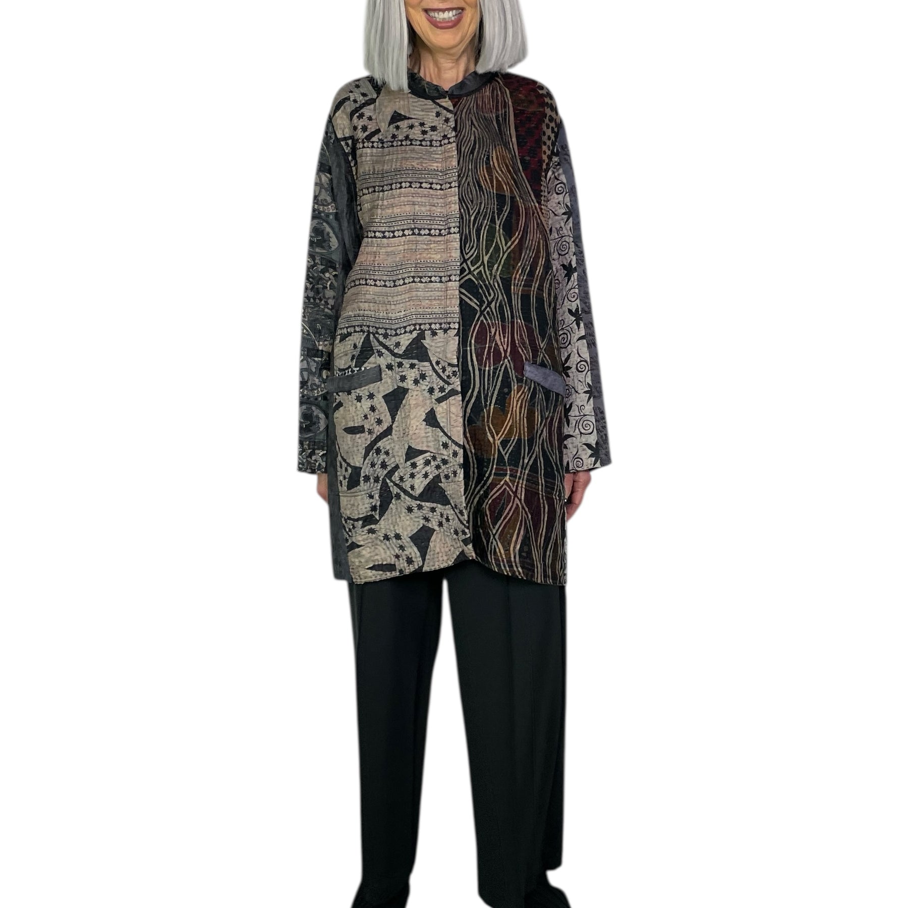 Reversible long sleeve vintage kantha jacket with a stand collar and snap front closure. Welt pockets on front side, patch pockets on reverse. Medium weight, 4-layer vintage saris with hand-stitching throughout. Relaxed fit, A-line silhouette.