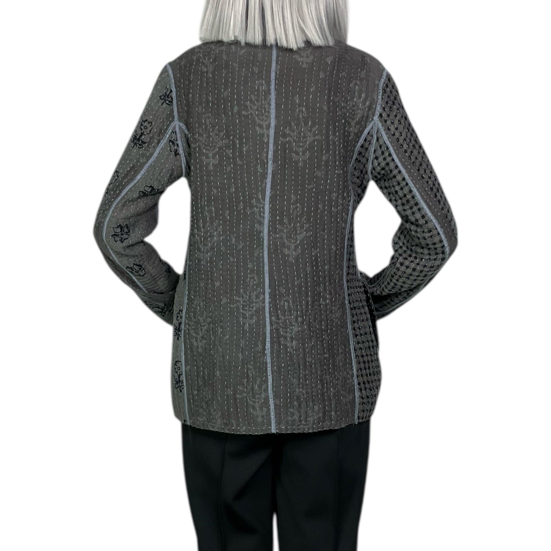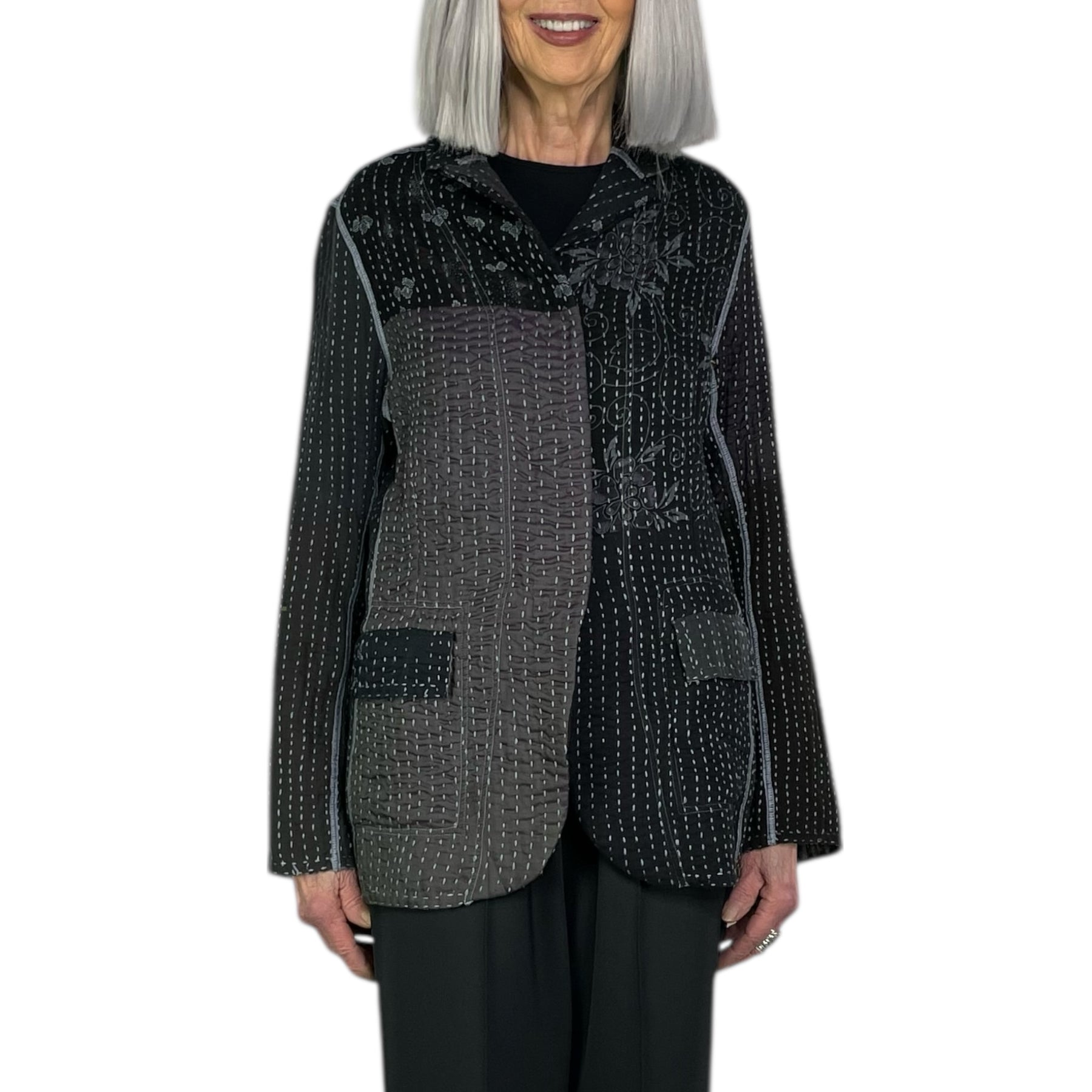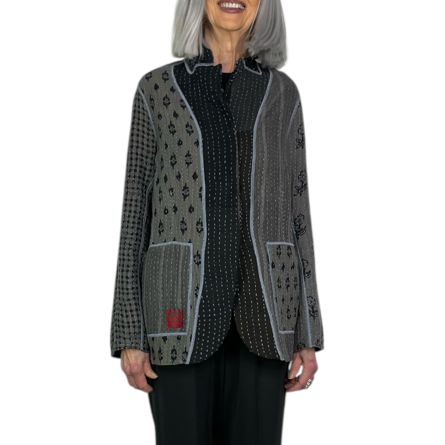 Reversible notch collar jacket with snap front closure and long sleeves. Flap pockets on front, patch pockets on reverse. 4-layer vintage saris with hand stitching throughout. Shaped silhouette, relaxed fit.