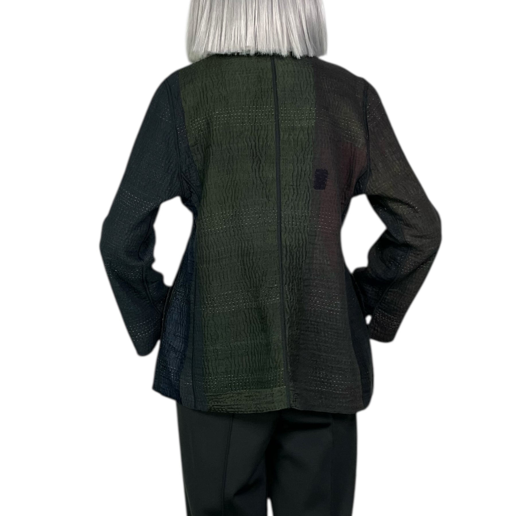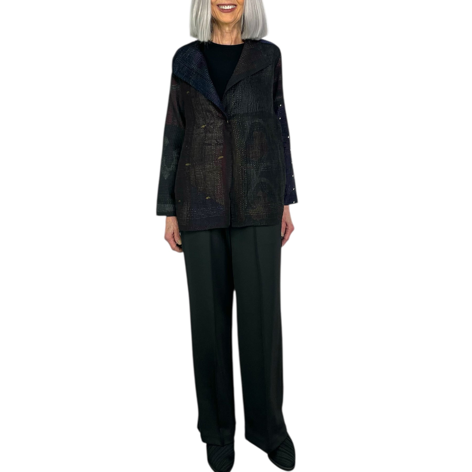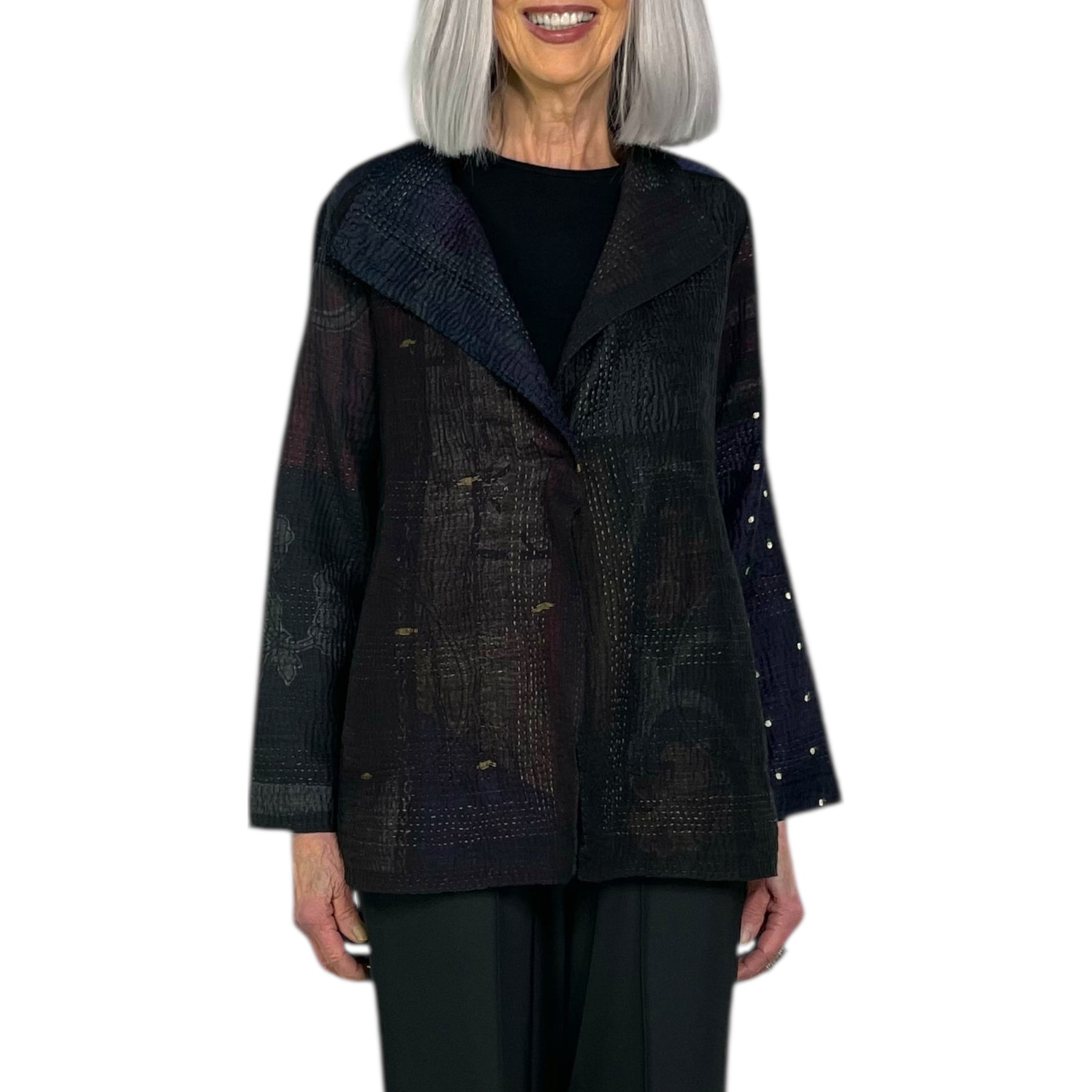 Reversible Jaipur patch jacket with long sleeves, stand collar and snap front closure. On seam pockets on front side, patch pockets on reverse. Medium weight, 4-layer vintage saris with hand-stitching throughout. Classic fit, shaped silhouette.