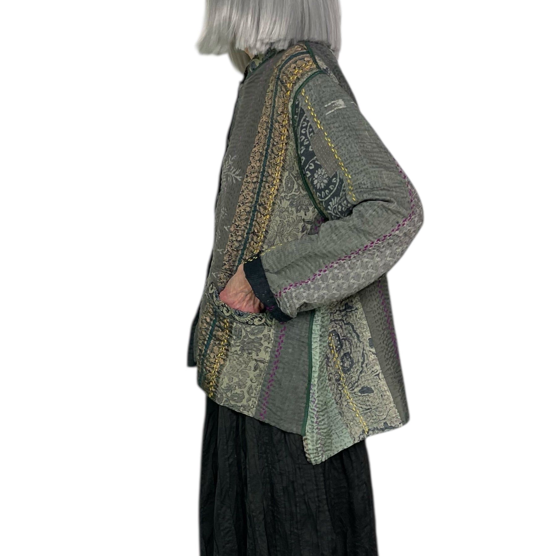 Reversible long sleeve vintage kantha jacket with a stand collar and snap front closure. Welt pockets on front side, patch pockets on reverse. Medium weight, jewel woven with vertical patches. 4-layer vintage saris with hand-stitching throughout. Relaxed fit, boxy silhouette. Hip length.