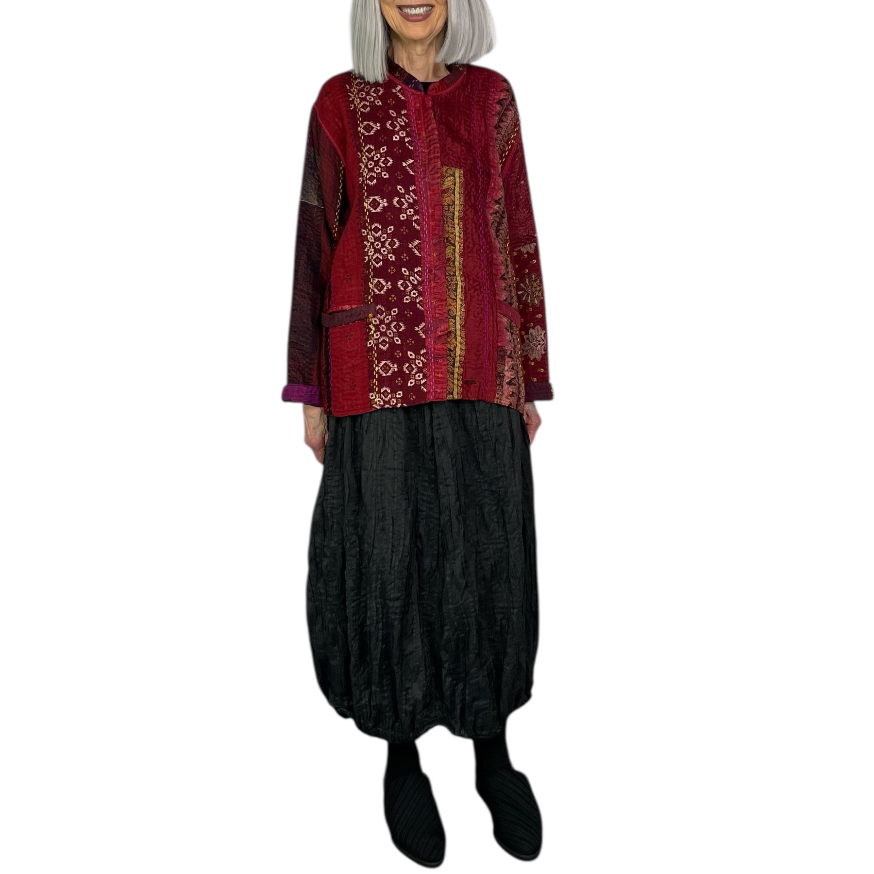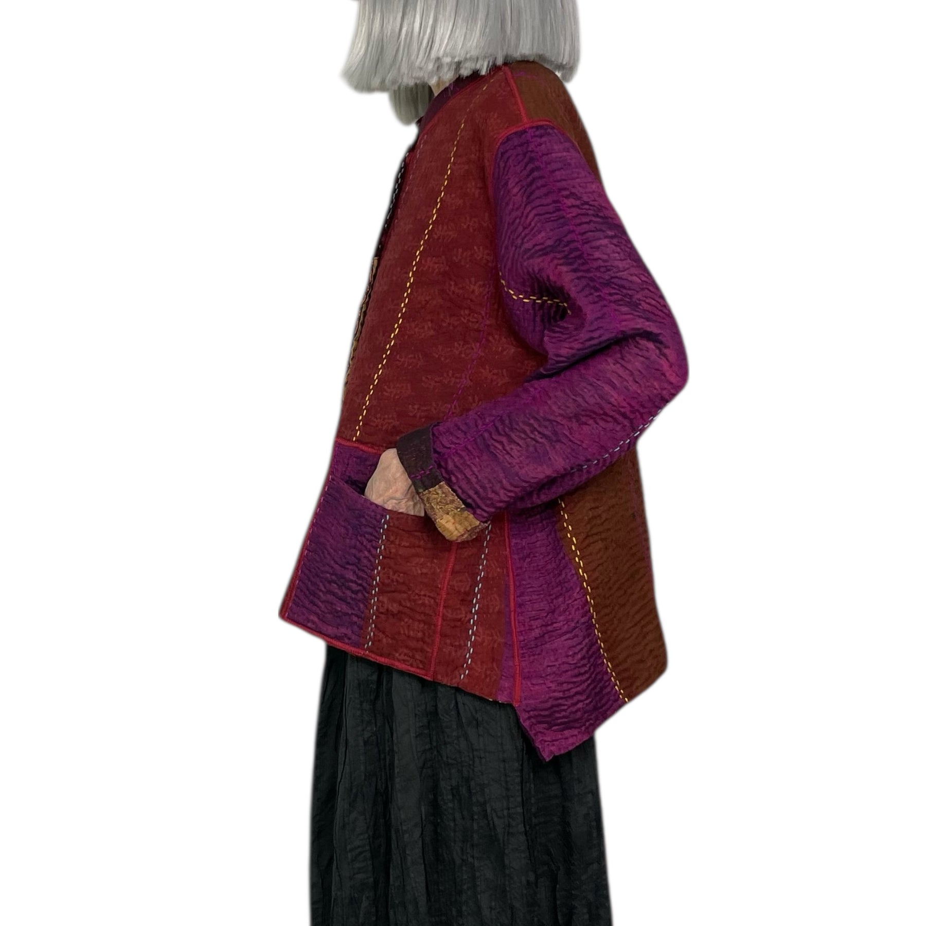 Reversible long sleeve vintage kantha jacket with a stand collar and snap front closure. Welt pockets on front side, patch pockets on reverse. Medium weight, jewel woven with vertical patches. 4-layer vintage saris with hand-stitching throughout. Relaxed fit, boxy silhouette. Hip length.