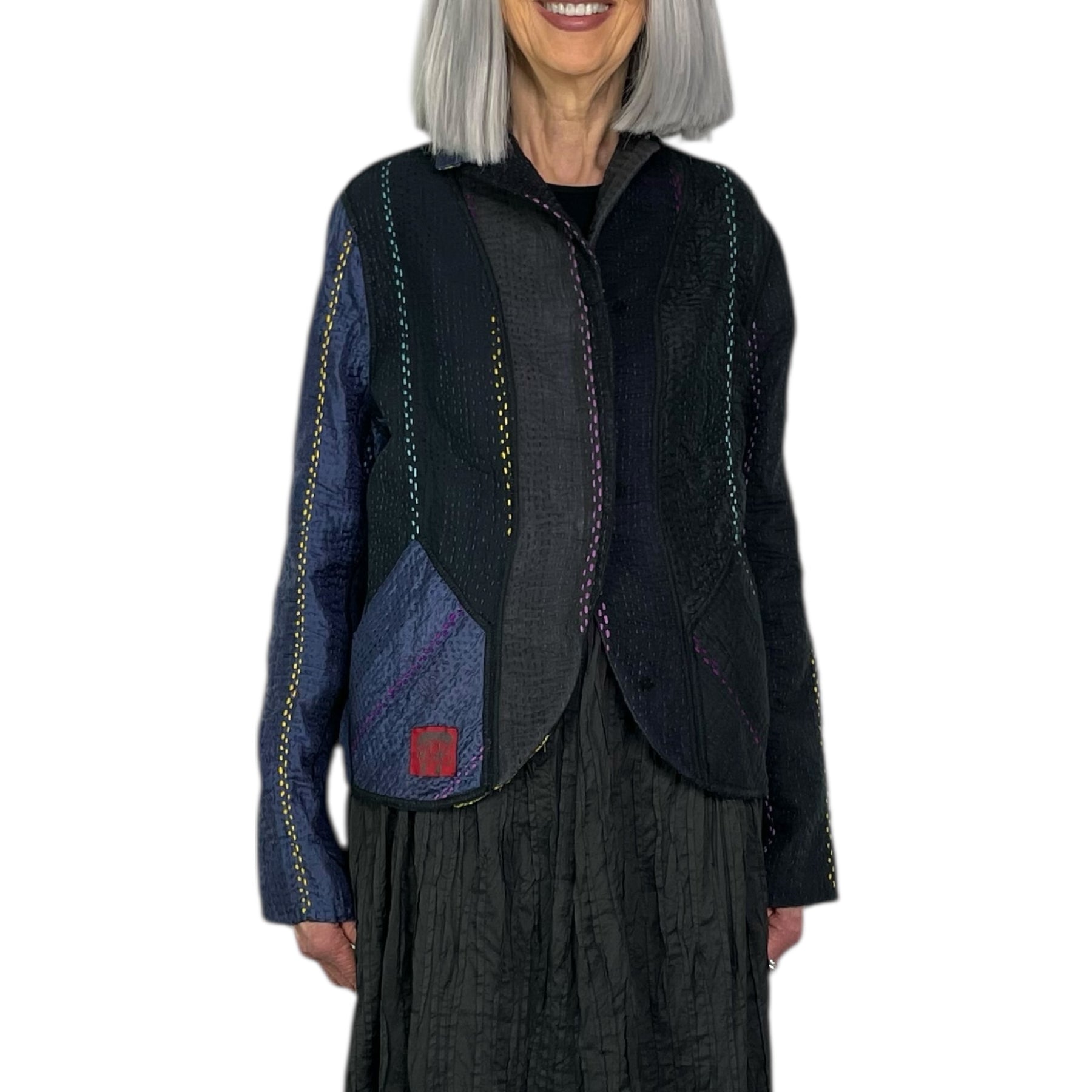 Reversible jewel woven cropped jacket. Semi-notch collar with snap front closure and long sleeves. Flap pockets of front, patch pockets on reverse. 4-layer vintage saris with hand stitching throughout. Shaped silhouette, relaxed fit.