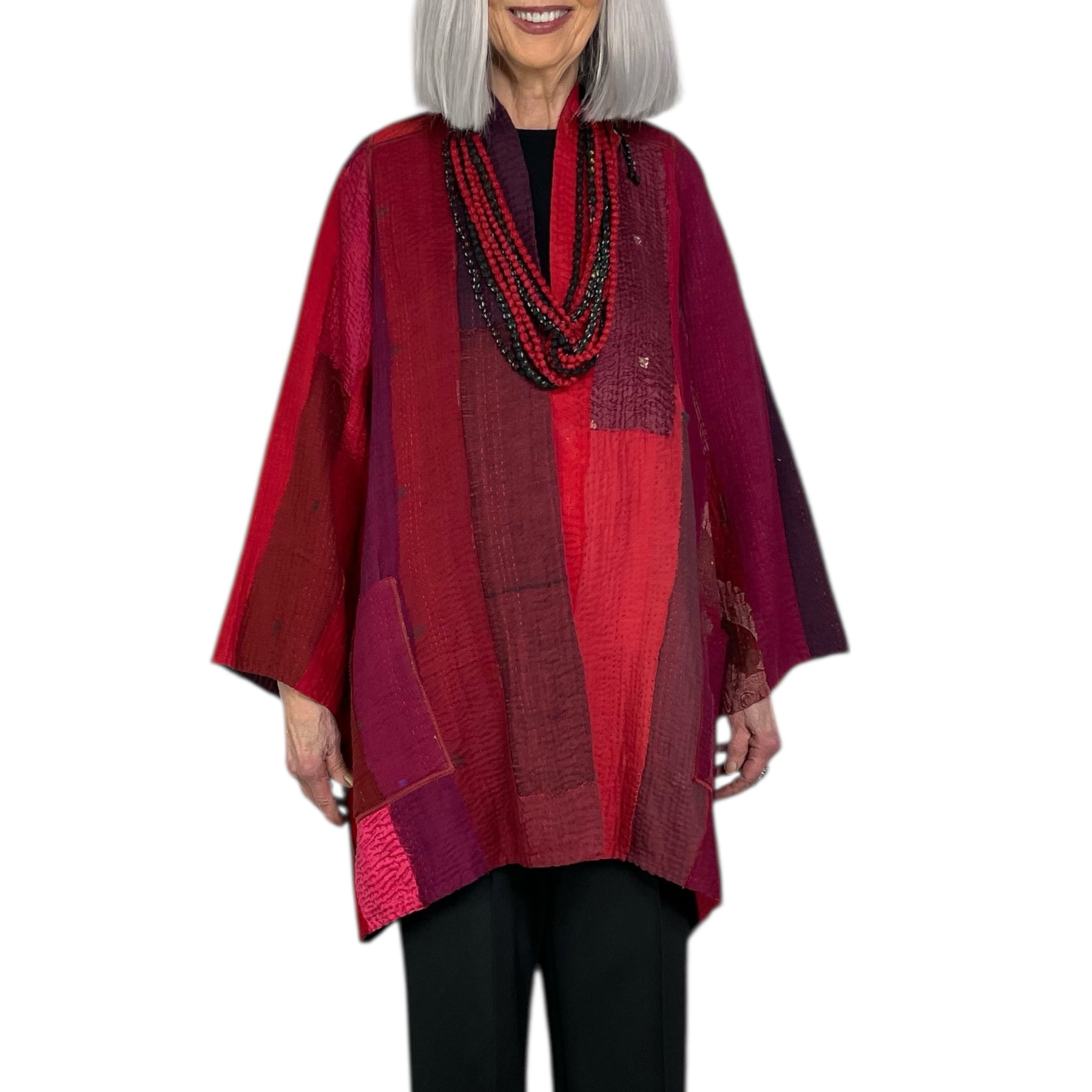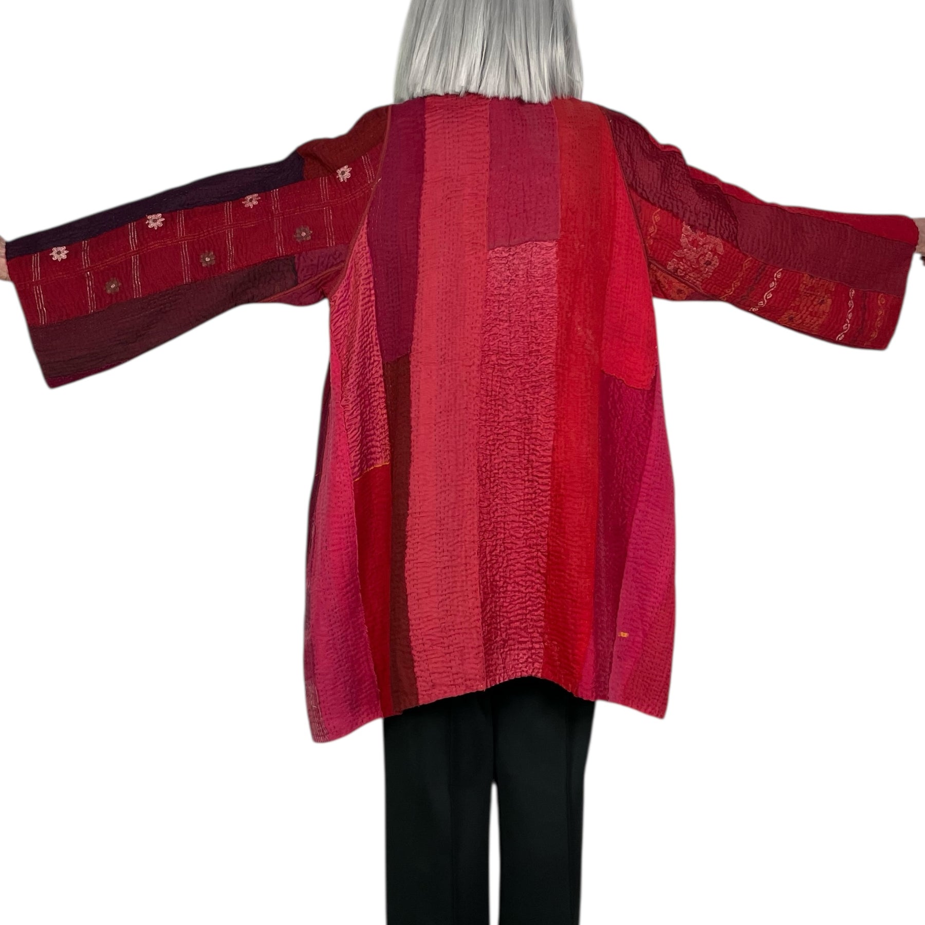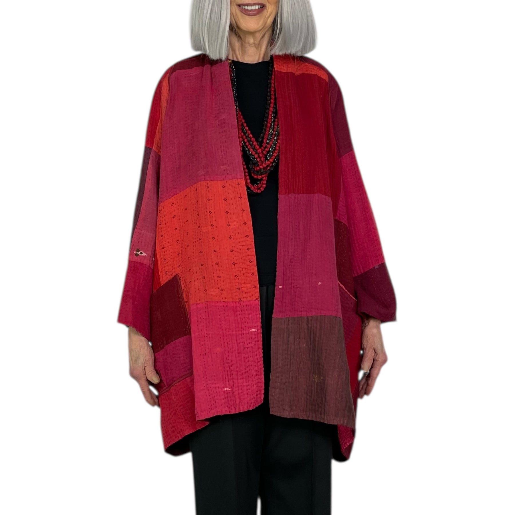 Reversible stripe & check cotton and silk patch open front jacket with a kimono collar and long sleeves. Patch pockets on both sides. Medium weight, 4-layer vintage saris with hand stitching throughout. A-line shape, relaxed fit.