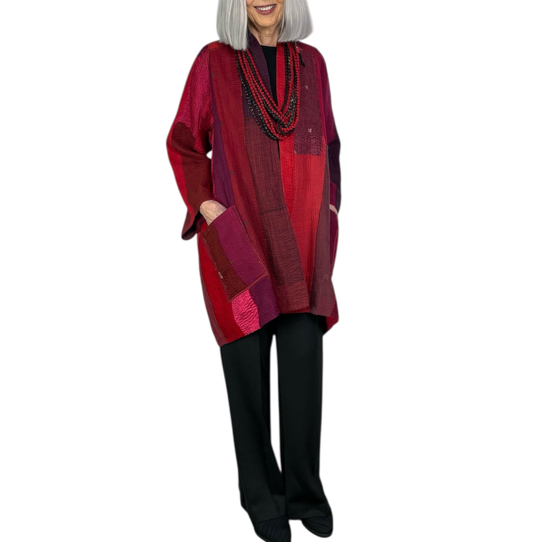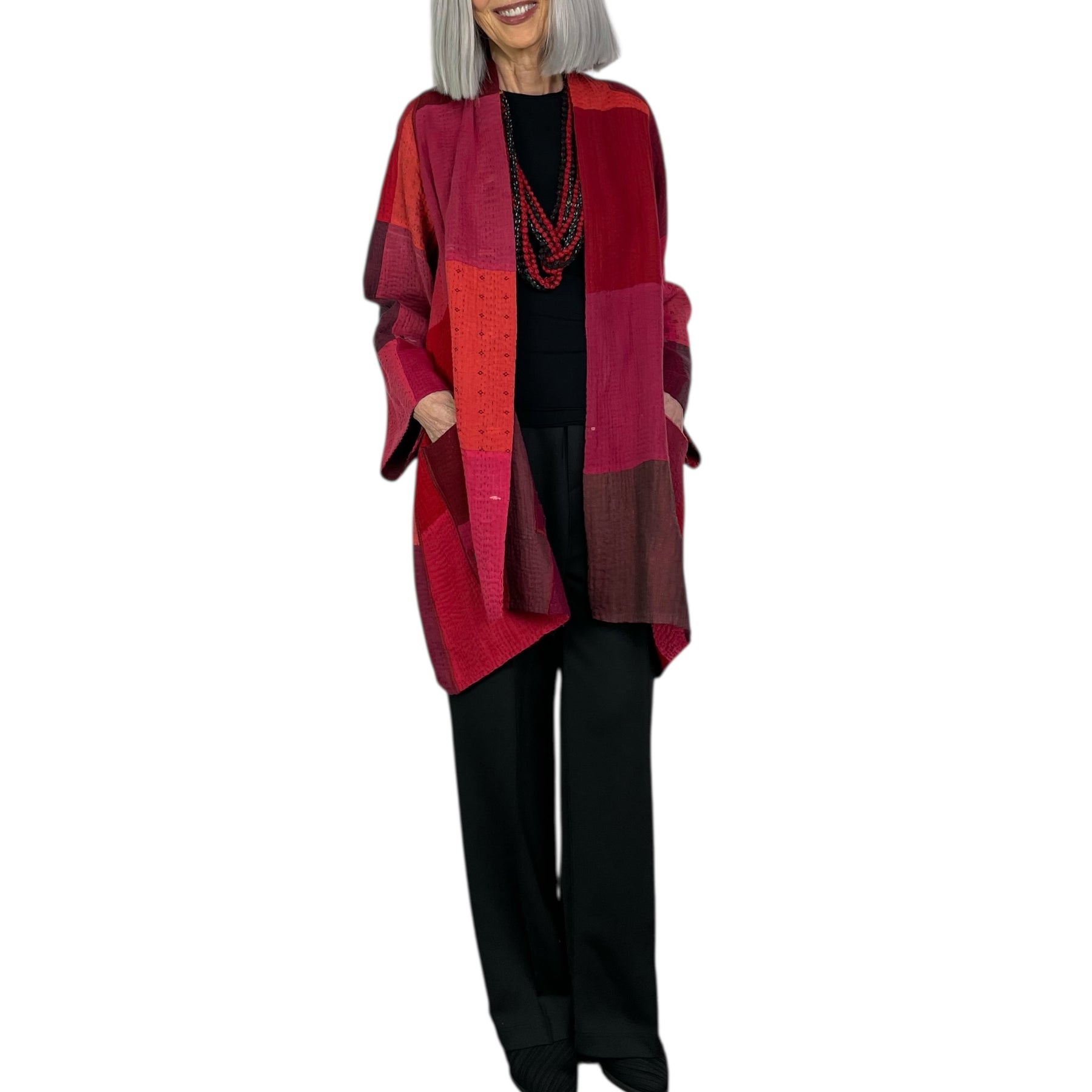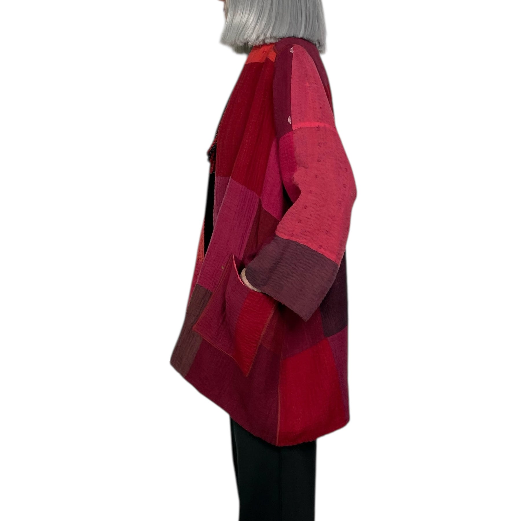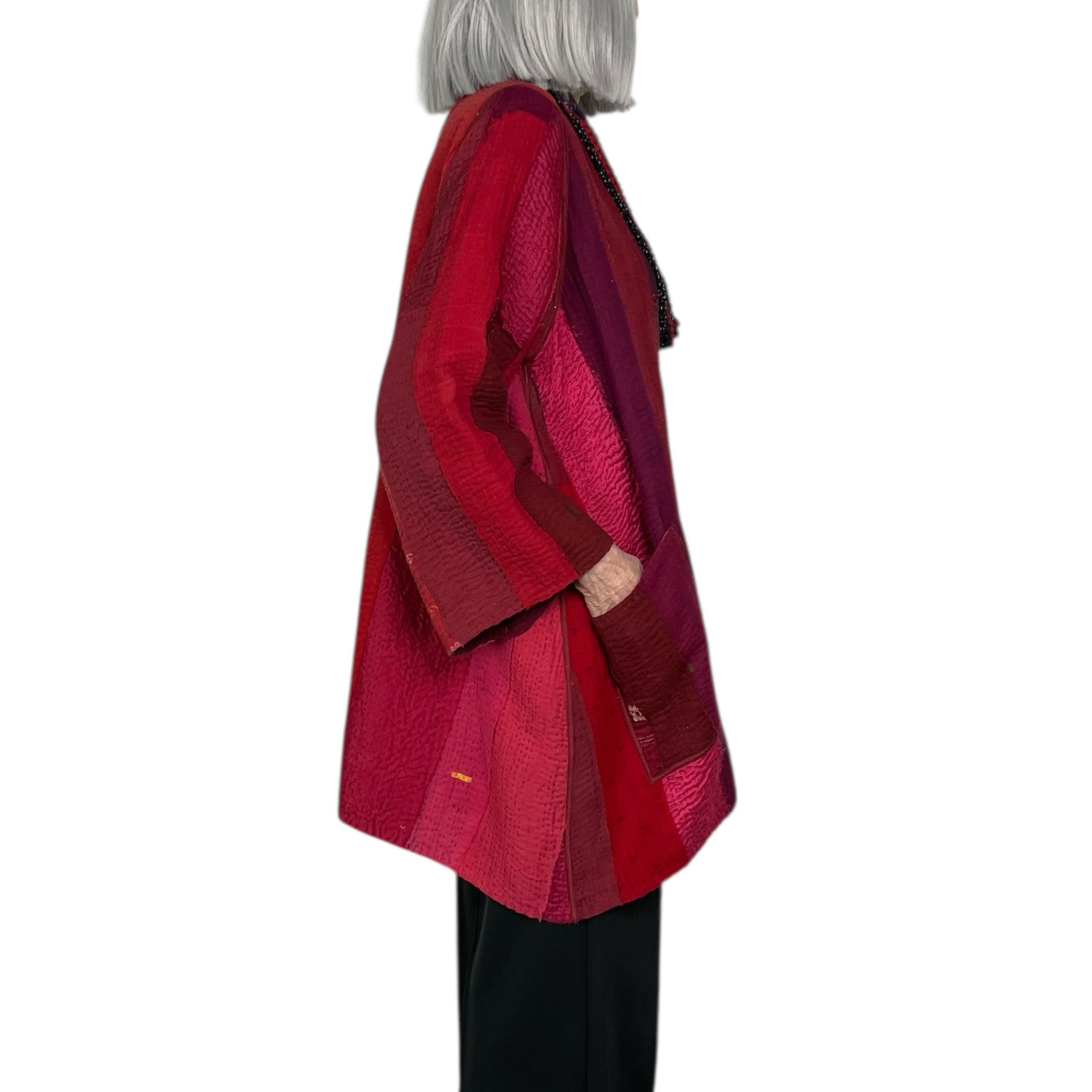 Reversible stripe & check cotton and silk patch open front jacket with a kimono collar and long sleeves. Patch pockets on both sides. Medium weight, 4-layer vintage saris with hand stitching throughout. A-line shape, relaxed fit.