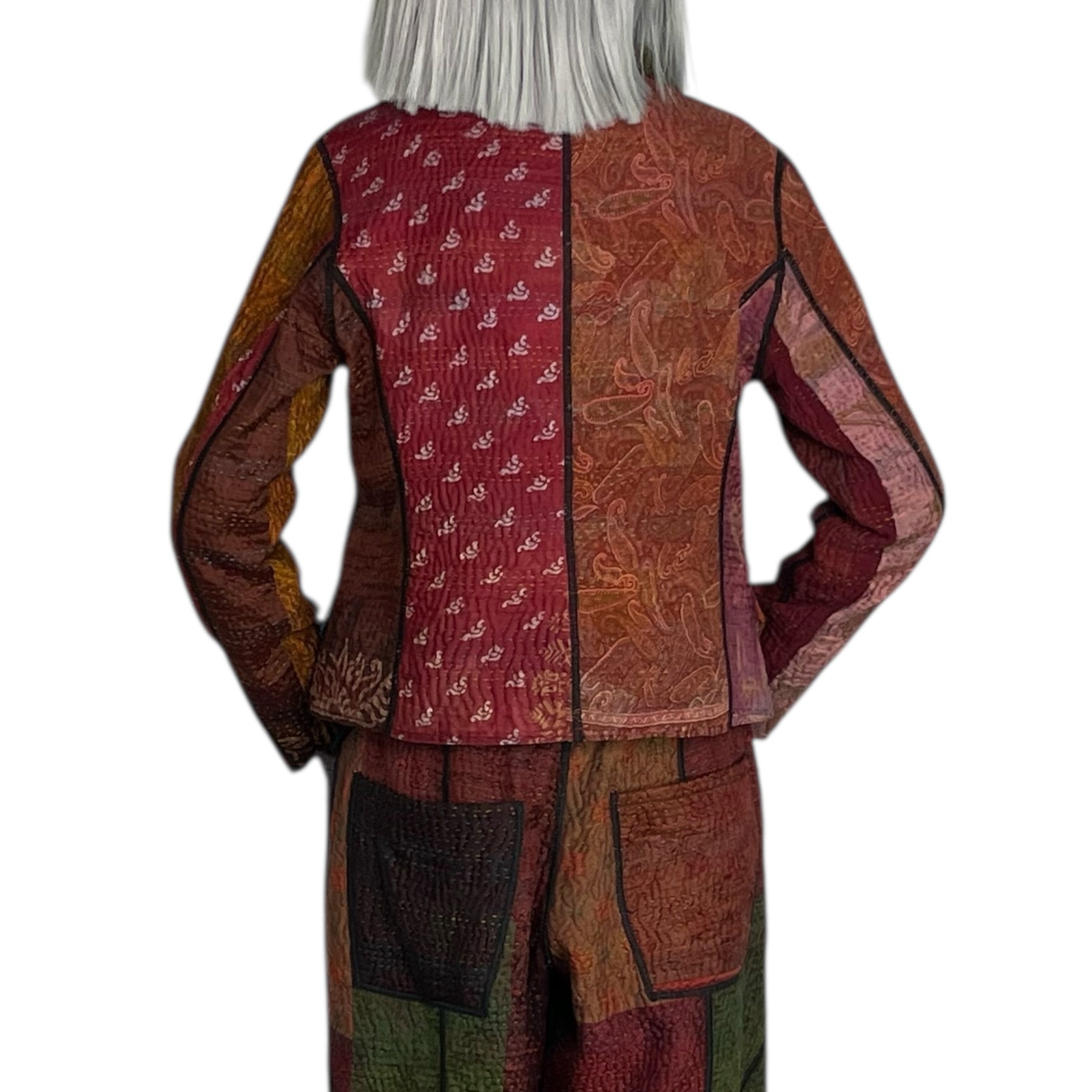 Reversible semi-notch collar jacket with snap front closure and long sleeves. Flap pockets on front, patch pockets on reverse. 4-layer vintage saris with hand stitching throughout. Shaped silhouette, relaxed fit.