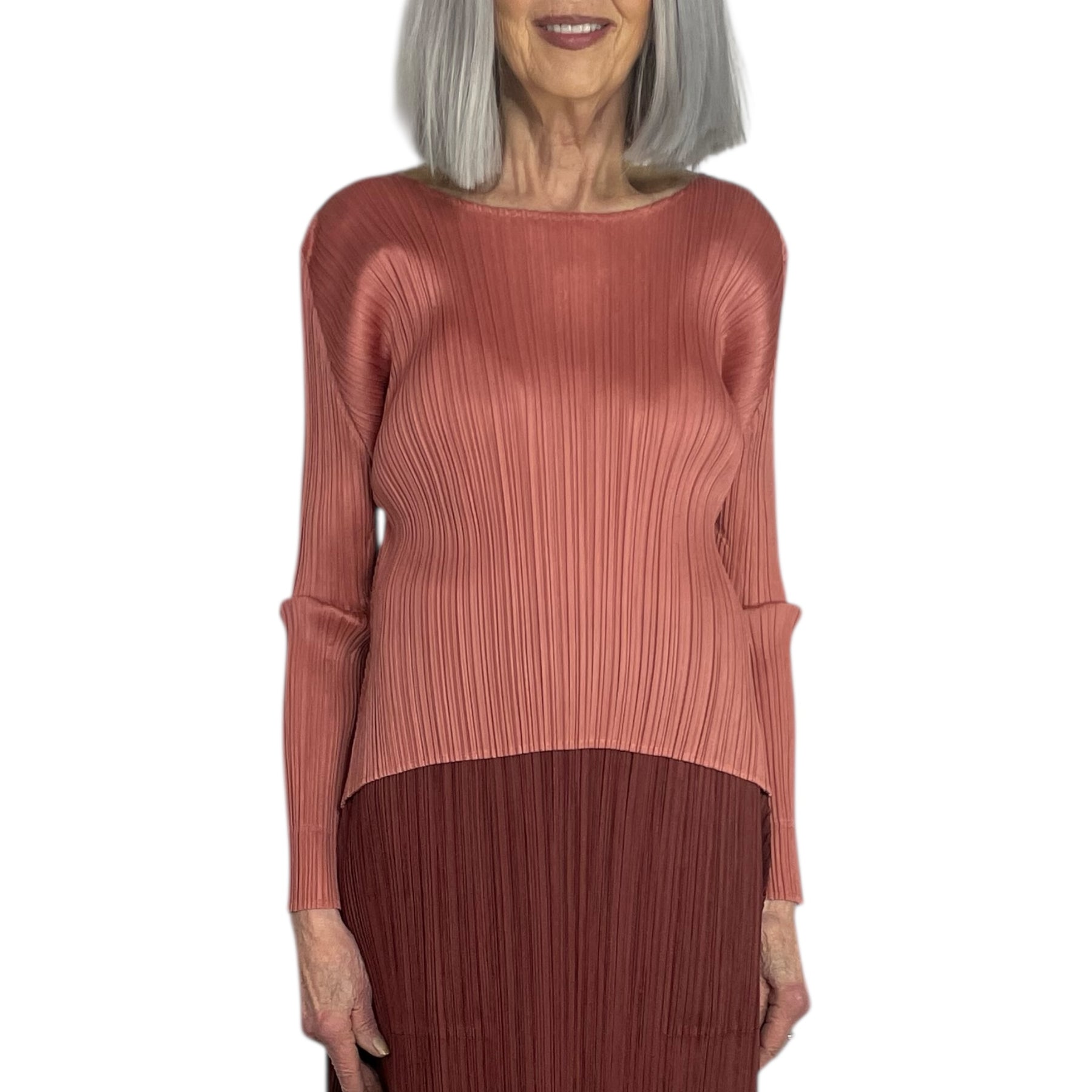 Pleated long sleeve top with a round neckline.