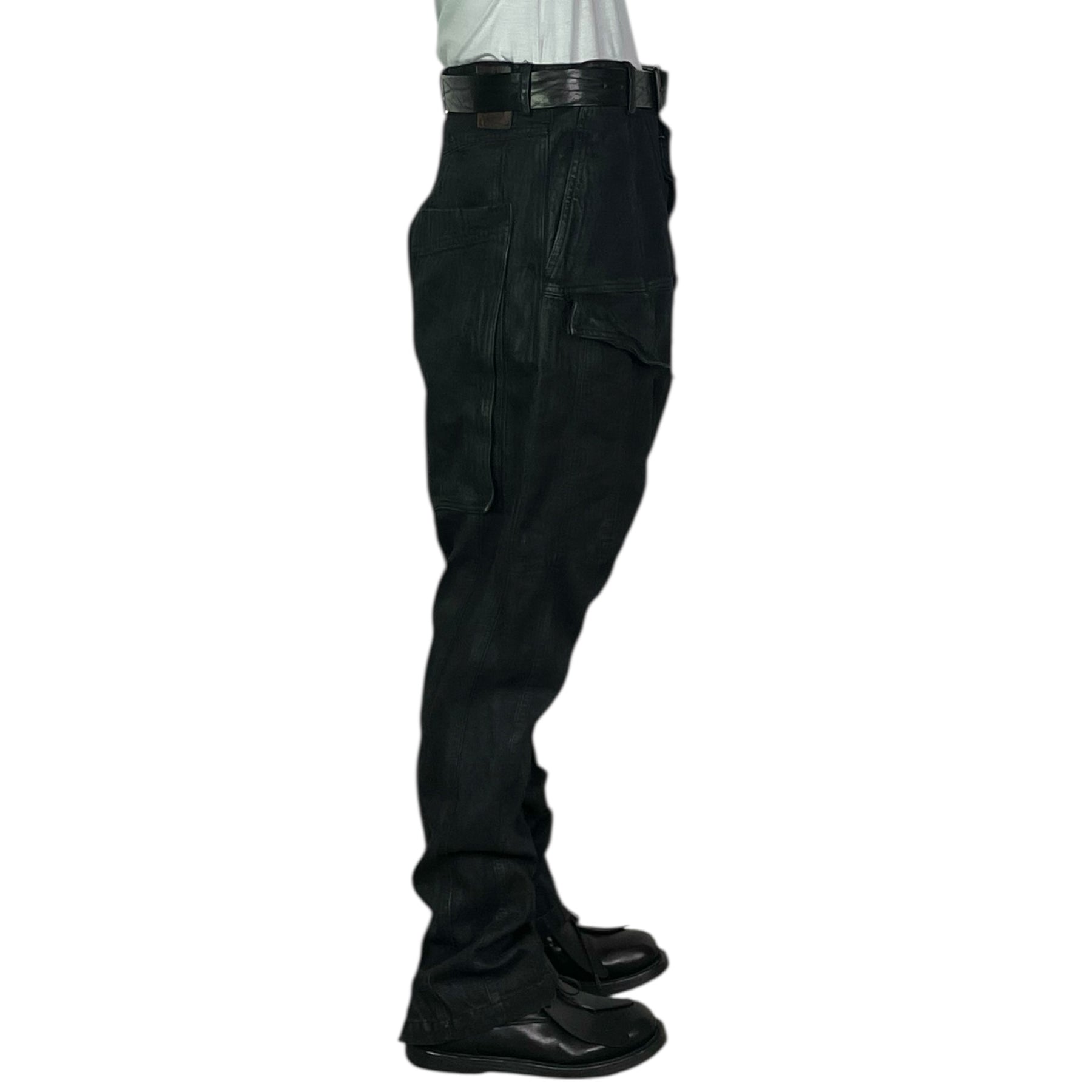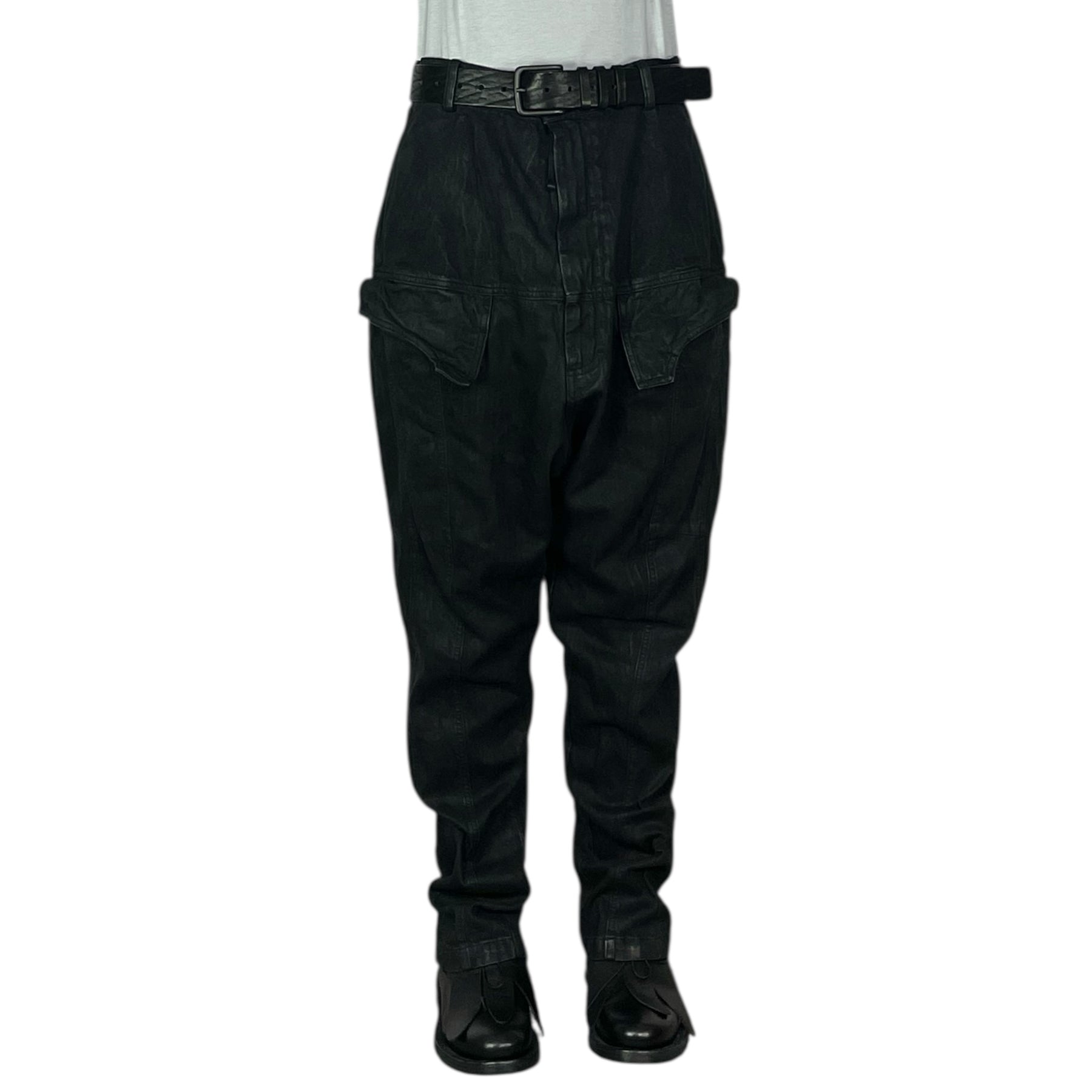 Drop crotch denim trousers with button/zip fly front and belt loops. Two side pockets, two front flap pockets, and two back elongated patch pockets. Loose fit at hips and thighs, tapering to a slim leg with slits at back hem.