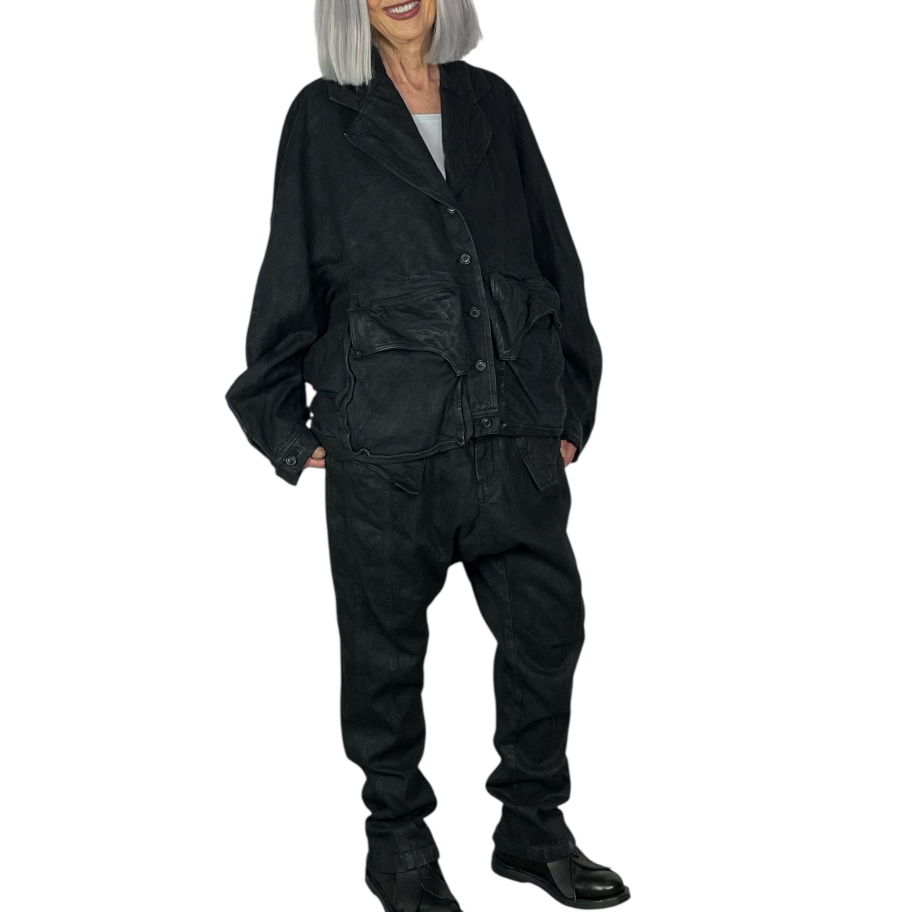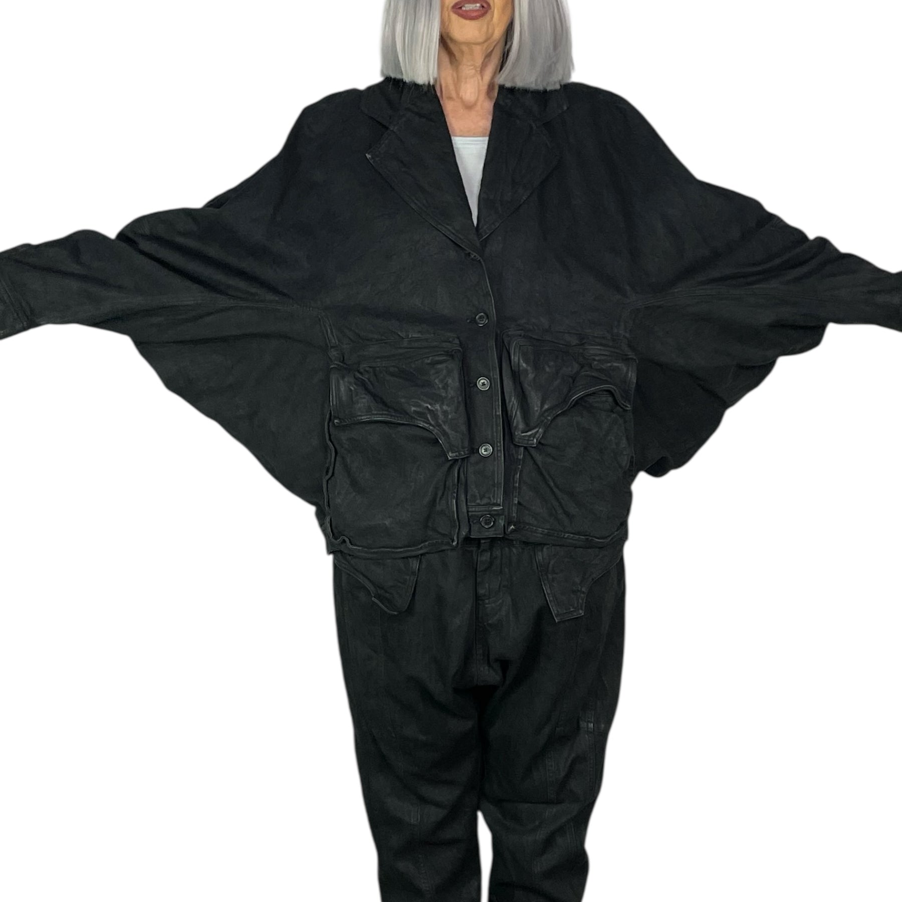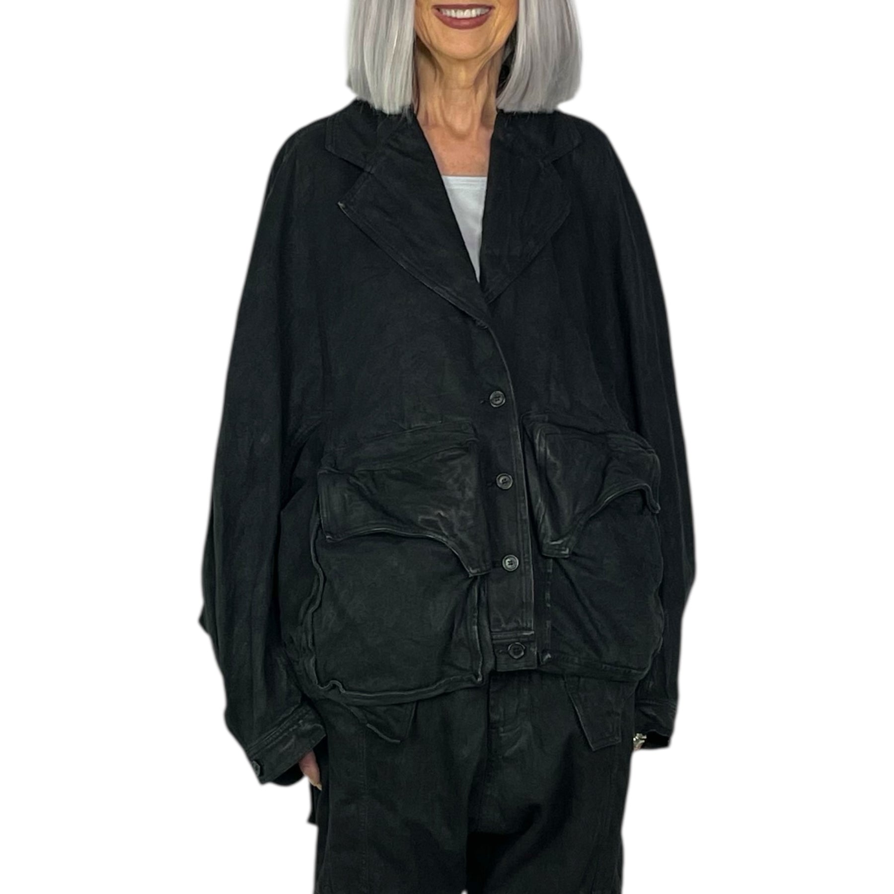 Dolman sleeve denim jacket with a wide notch collar and button front closure.  Two large gusseted flap pockets on front.  Button cuffs and button tabs at back banded hemline.