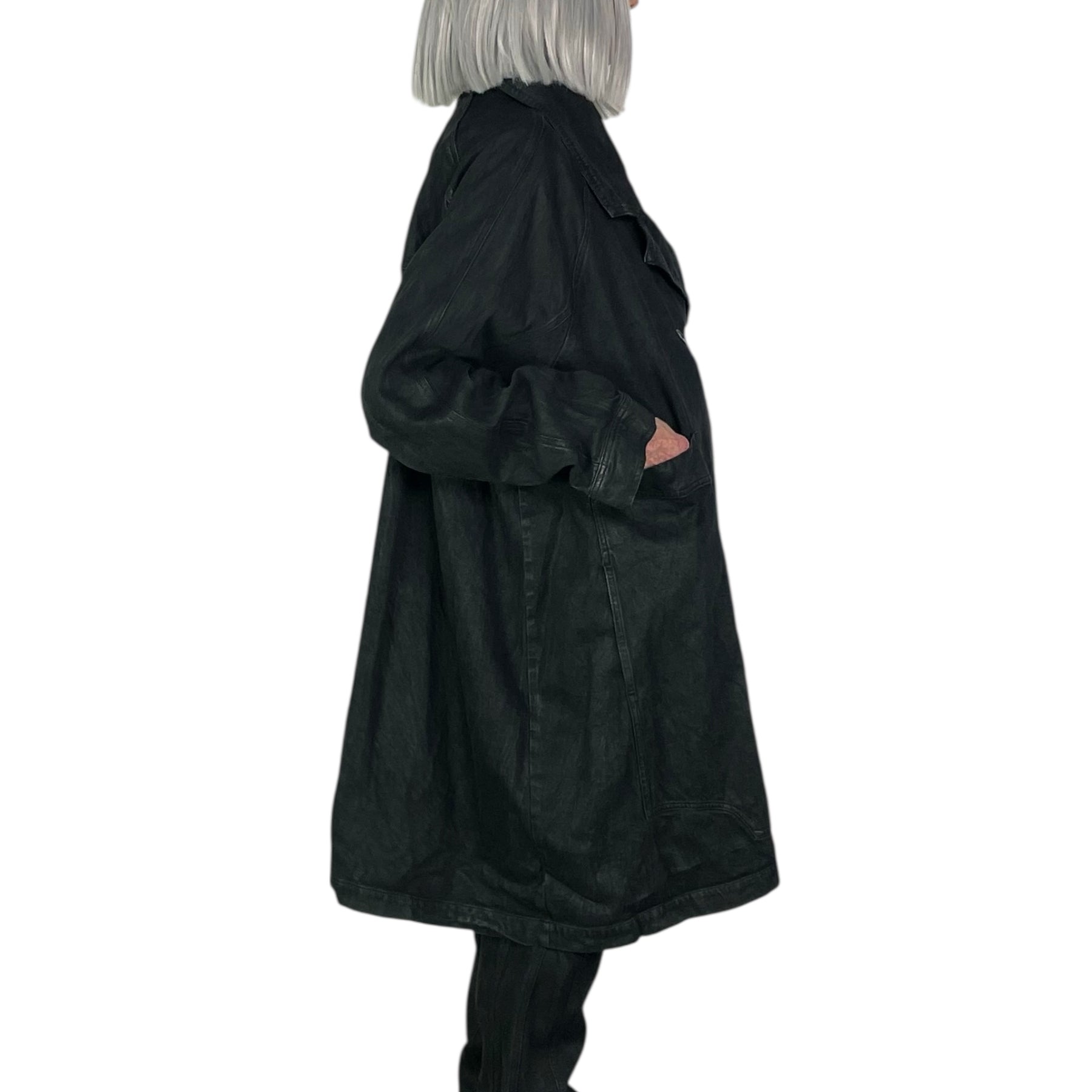 Long sleeve double breasted denim coat with off-center button placket.  Two elongated front patch pockets and back center vent.  Generous fit.