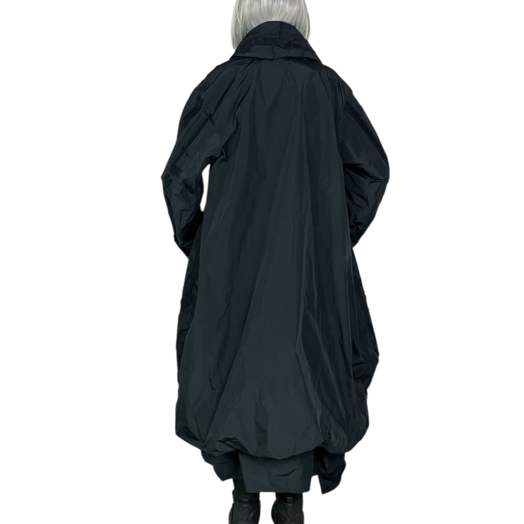 Jacquard taffeta shawl collar coat with long sleeves and two side welt pockets. Shawl collar with double breasted button front closure. Button cuffs, balloon shaped silhouette.