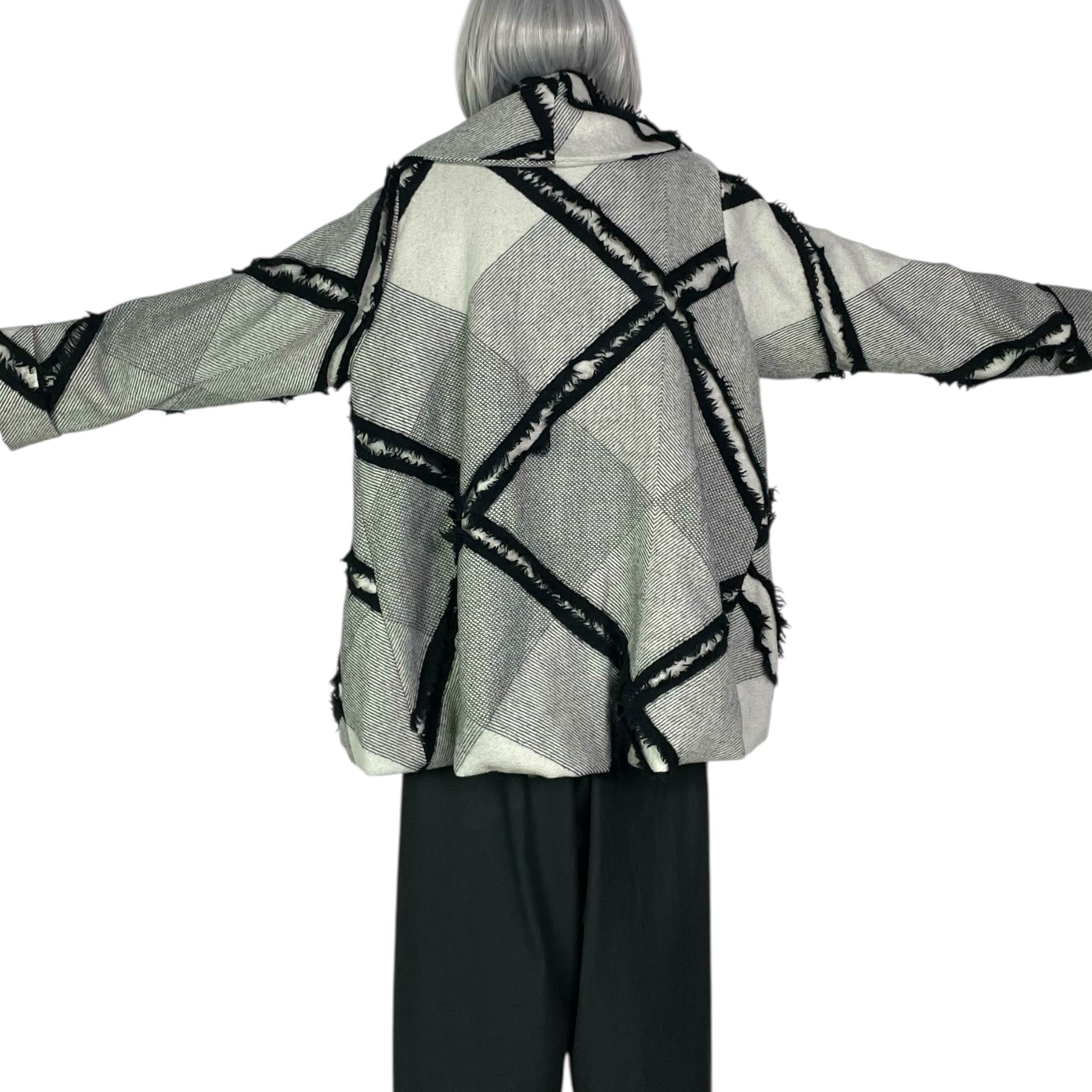 Long sleeve coat with snap front closure and ruched shawl collar. Two side slit pockets. Button and cord decoration on front, fringed line detailing throughout. Generous, oversized fit.
