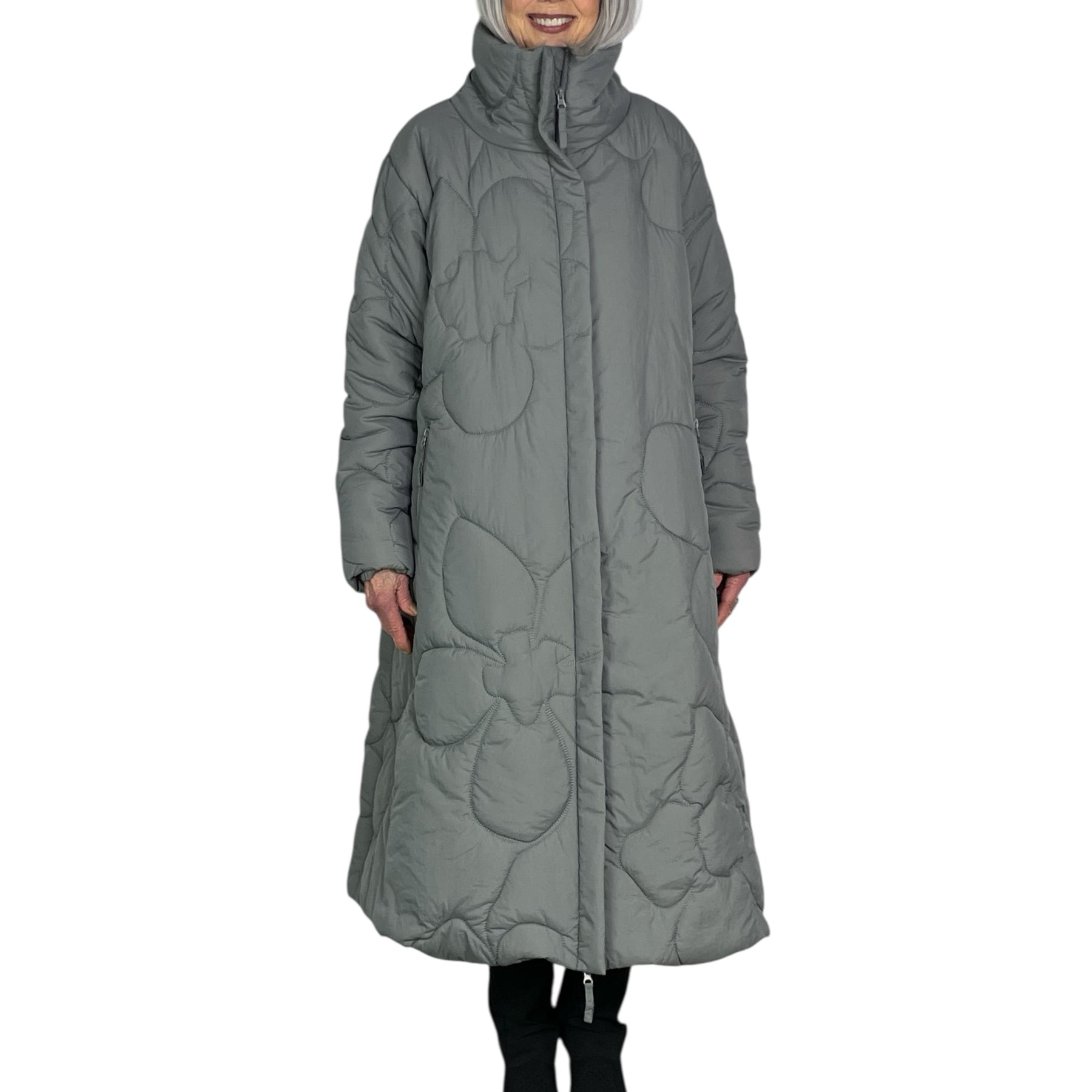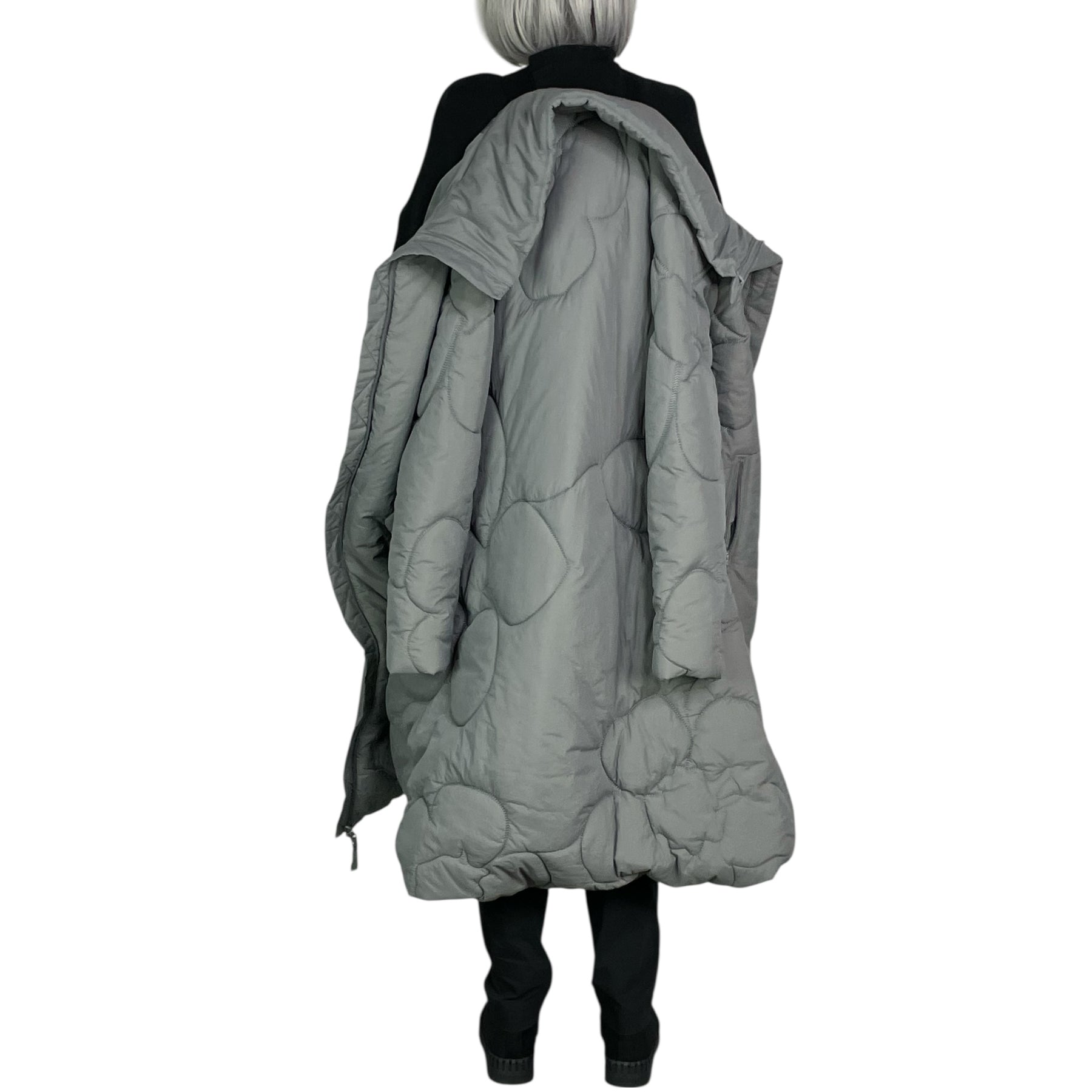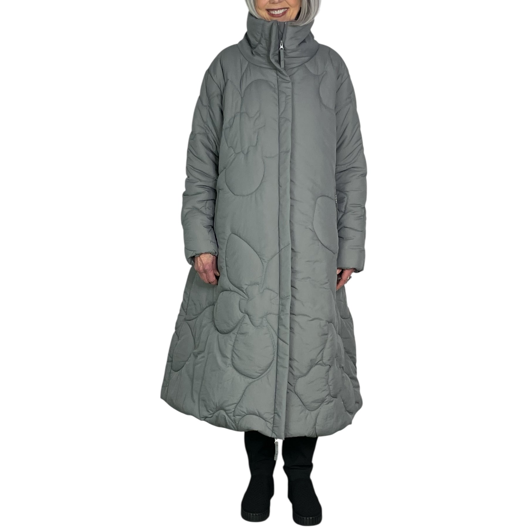 Quilted puffer long coat with 2-way zip front closure and high neckline. Two side zippered pockets. Interior shoulder straps for hands-free carrying.