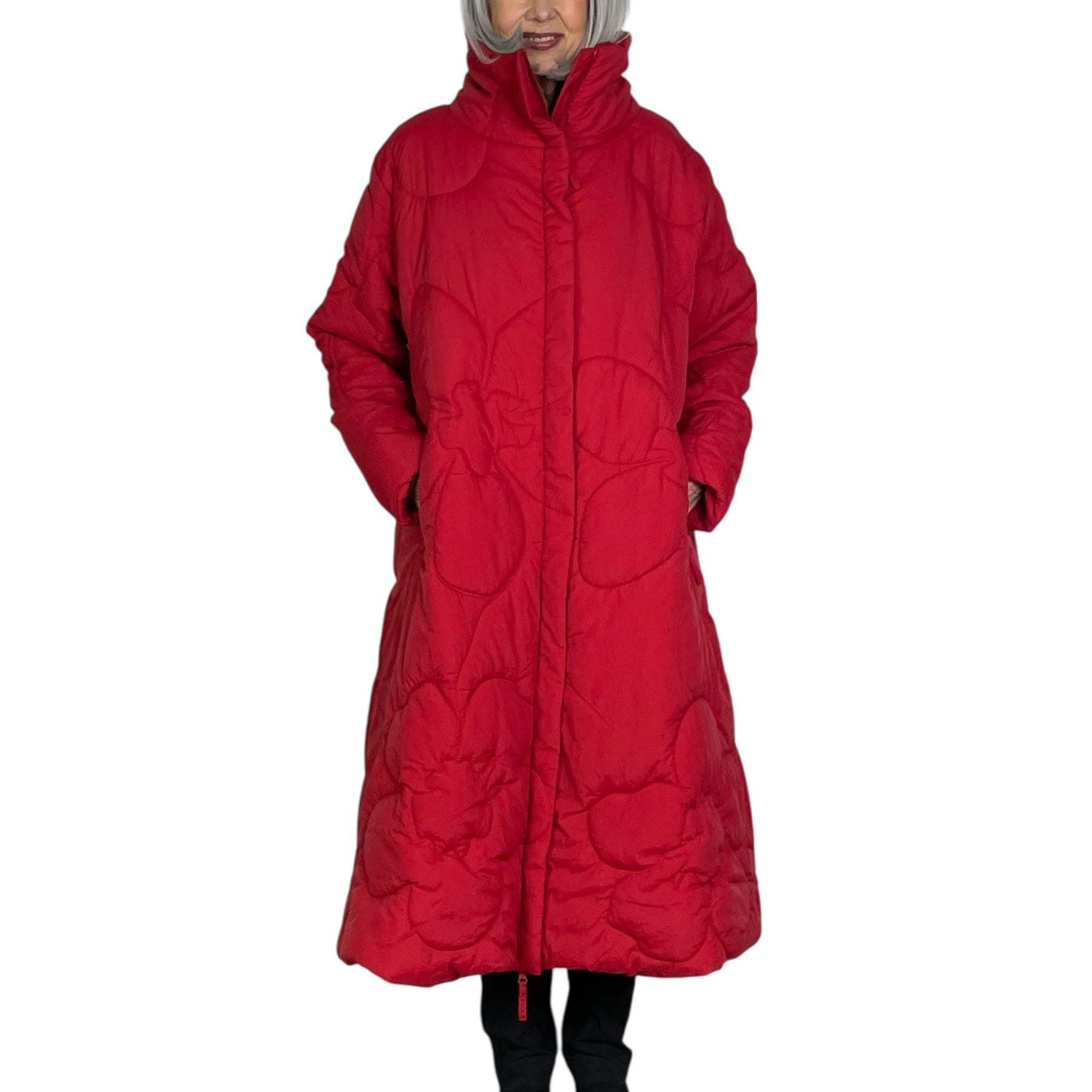 Quilted puffer long coat with 2-way zip front closure and high neckline. Two side zippered pockets.  Interior shoulder straps for hands-free carrying.