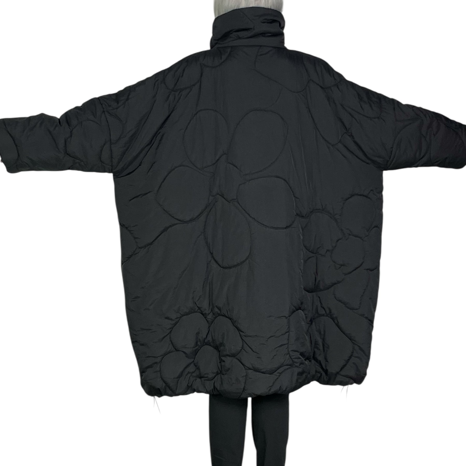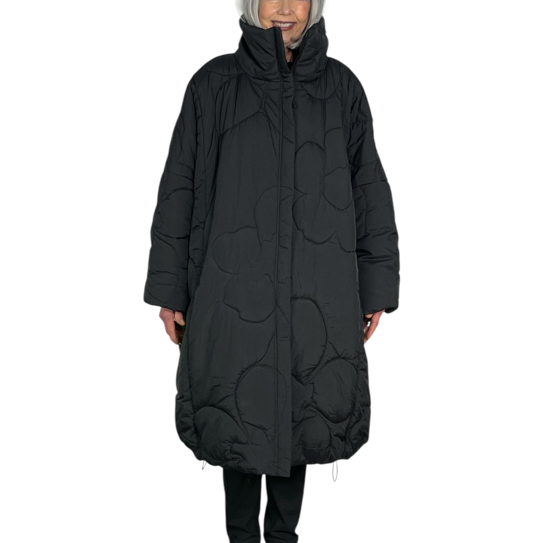 Quilted puffer car coat with 2-way zip front closure and high neckline. Two side zippered pockets, elasticized cuffs, drawcord adjustment at hem. Wide silhouette, generous fit.  Interior shoulder straps for hands-free carrying.