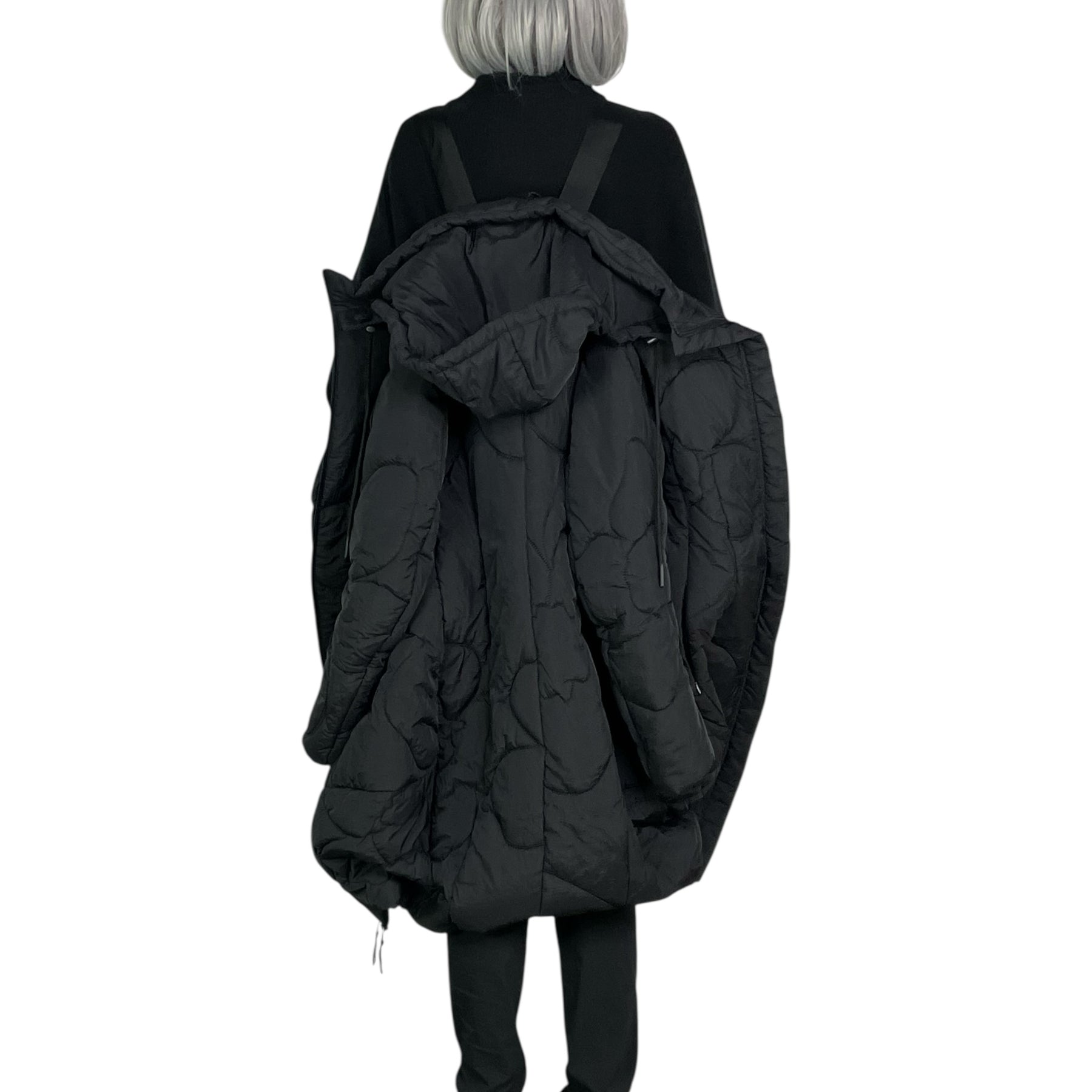 Shaped quilted puffer coat with 2-way zip front closure and hood with drawstring. Two side zippered pockets. Interior shoulder straps for hands-free carrying.