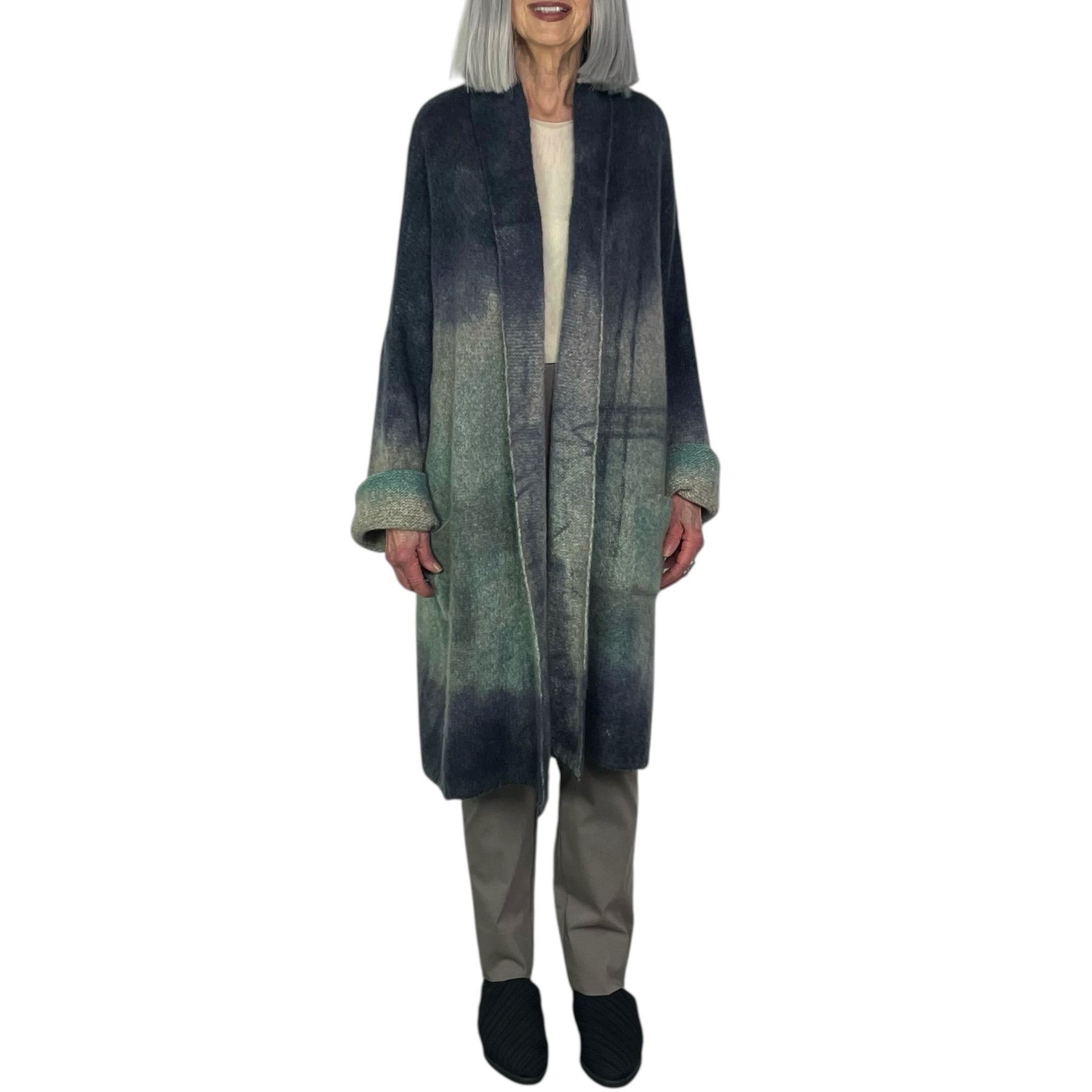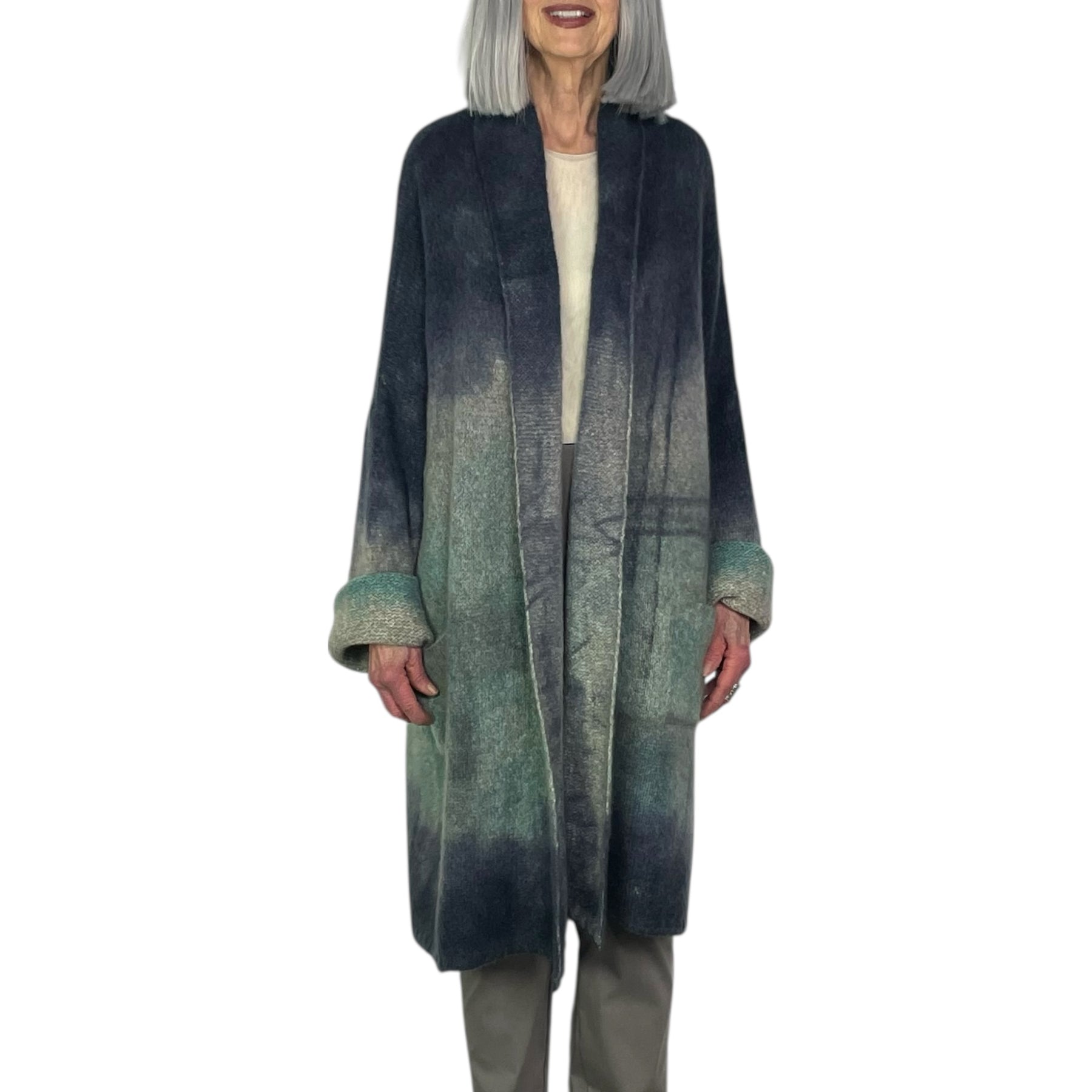 Long sleeve painted cashmere open front coat with a shawl collar and two front patch pockets. Relaxed fit. Also shown worn upside-down for a different silhouette.