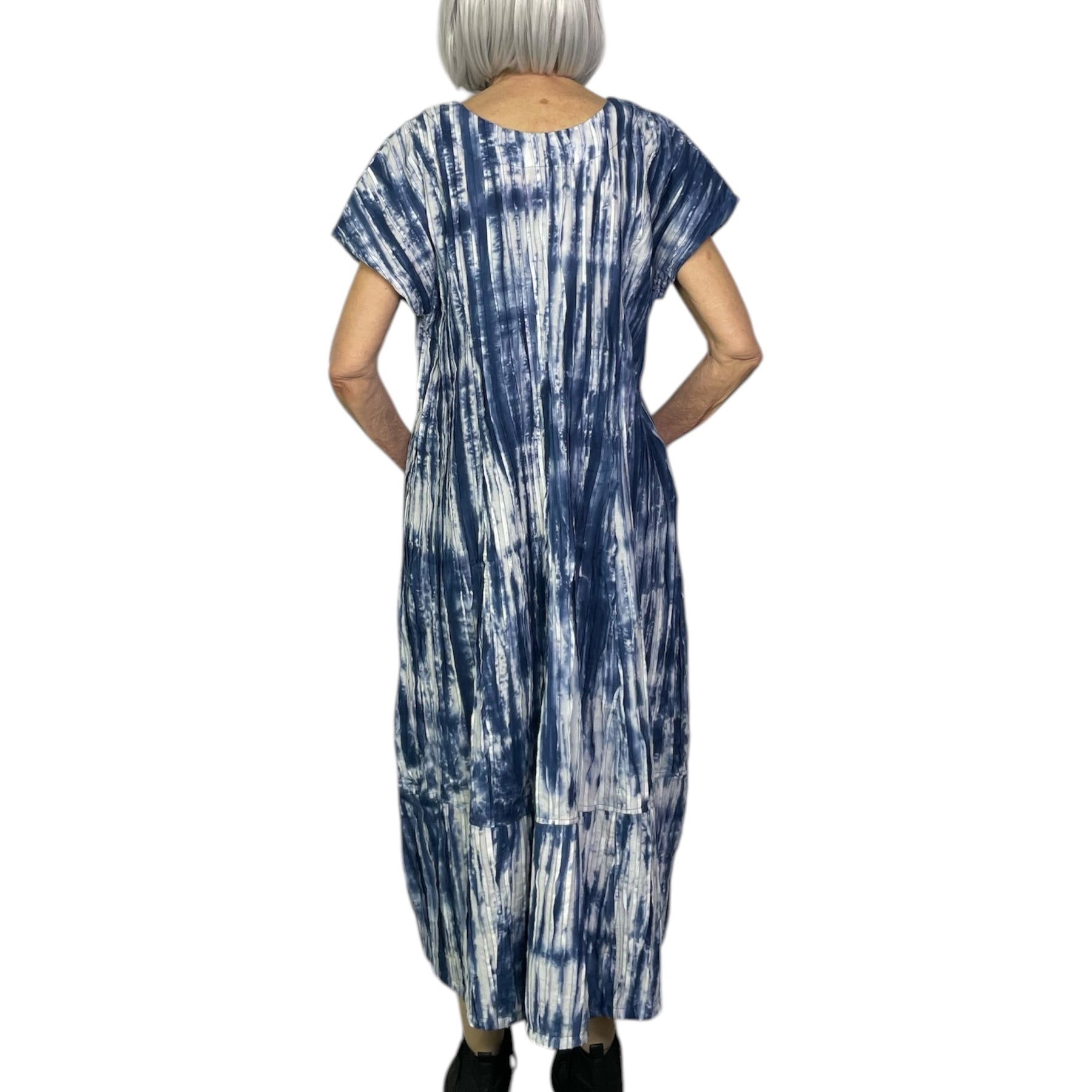 Shaped midi dress with a V-neckline and french sleeves. On-seam pockets, relaxed fit. Lightweight tie-dye cotton cambric with ripple tucks throughout garment.