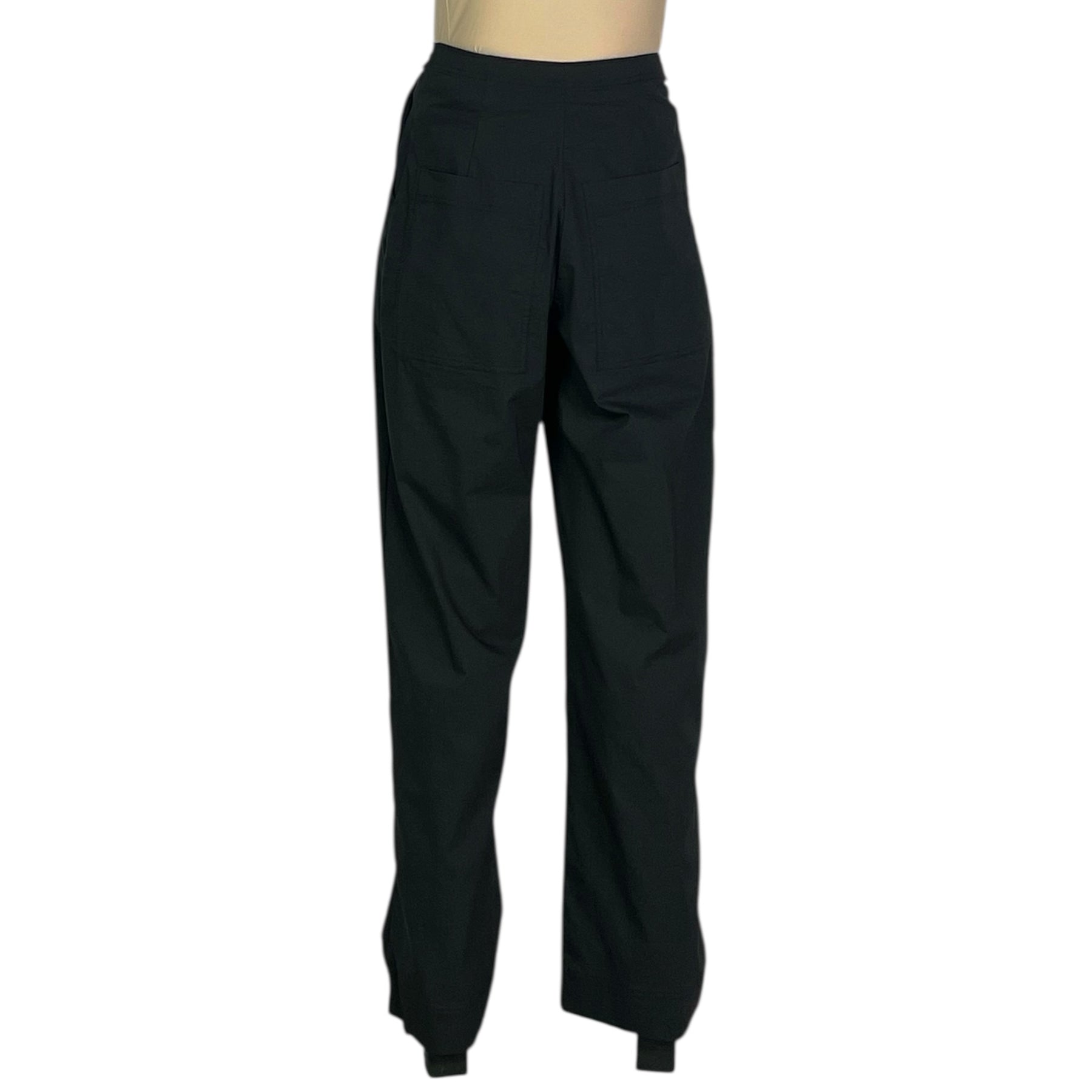 Wide leg pants with an elasticized waistband.  Two side pockets, two back patch pockets.  Side slits at hemline.