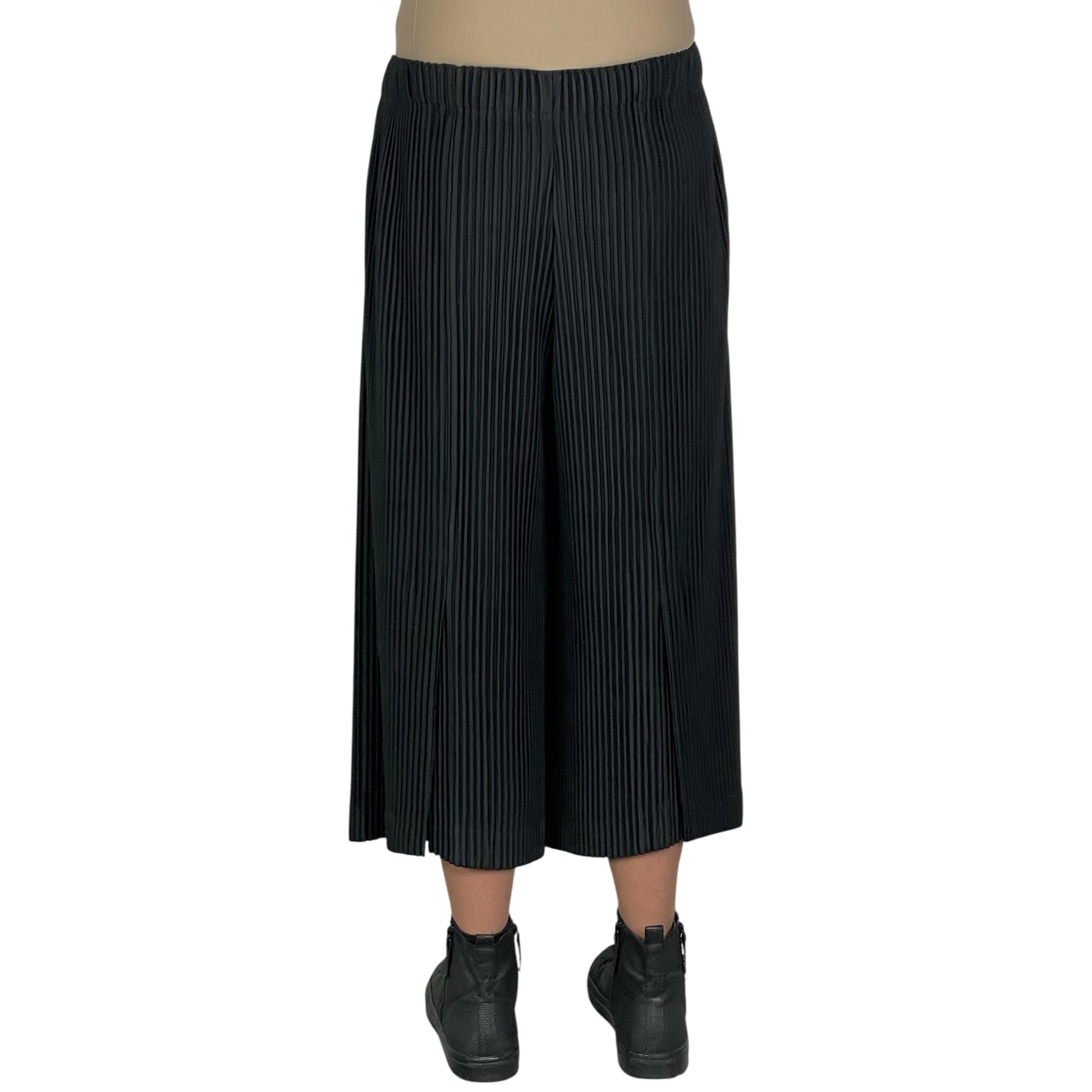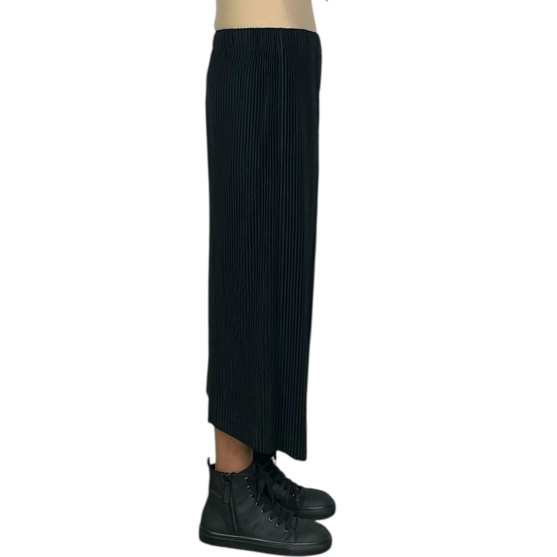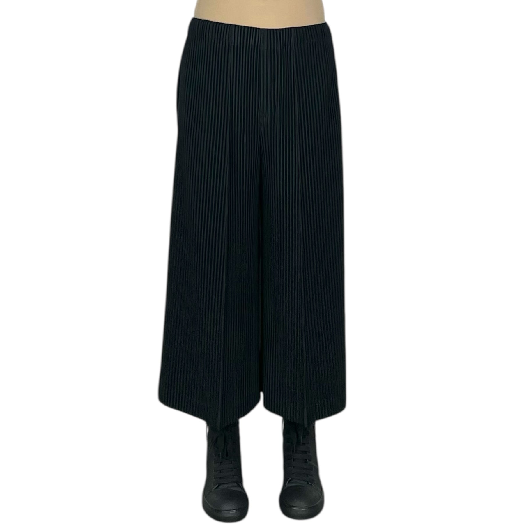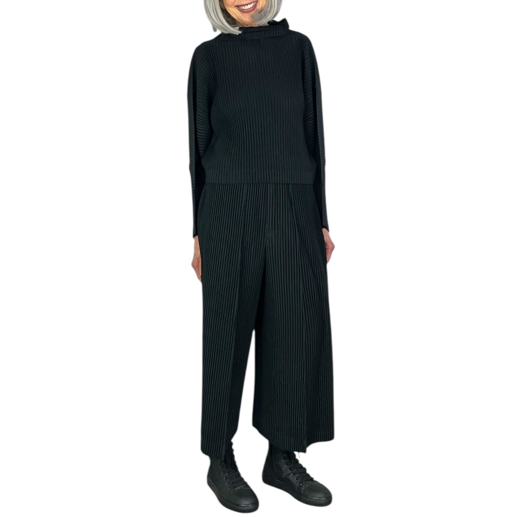Unisex pleated pant with elasticized waistband and drawstring adjustment.  Button-fly front and two side pockets.  Flared leg with slits at center back hem and front center seam detailing.