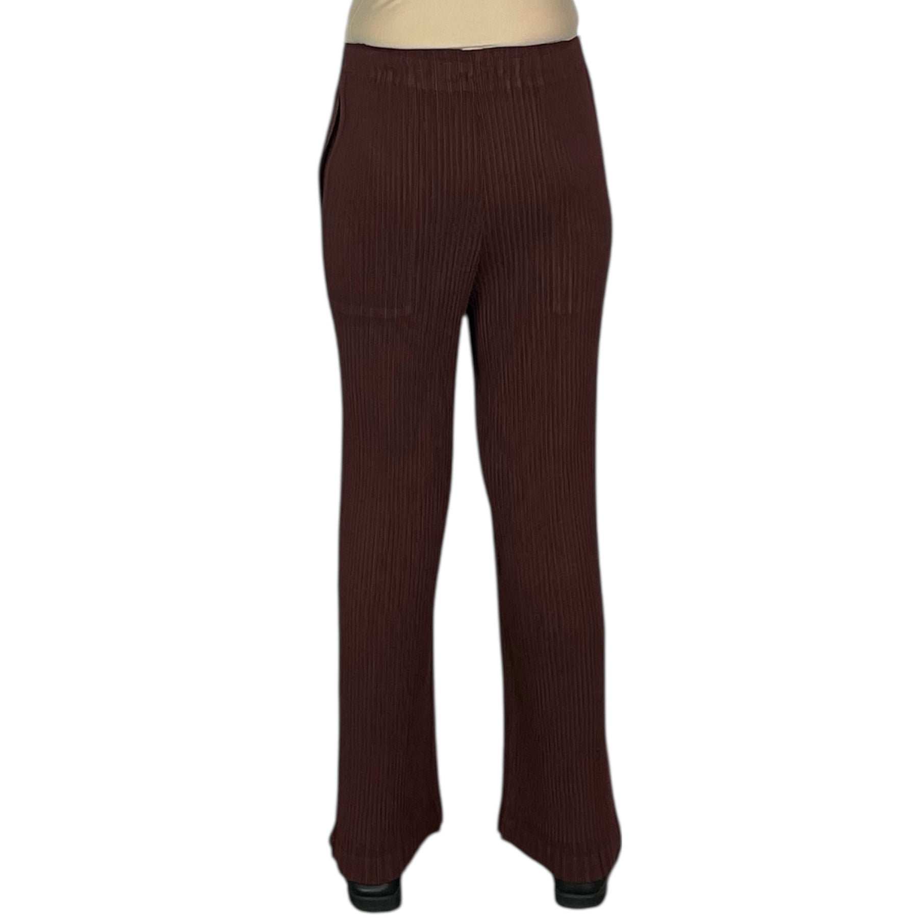 Straight leg pleated pant with elasticized waistband and two side pockets.