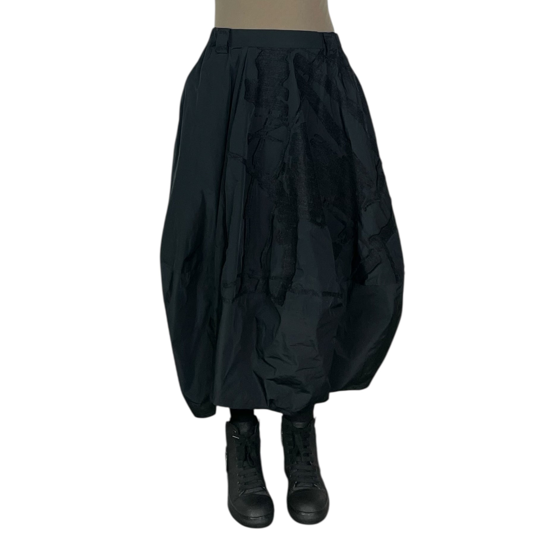 Jacquard taffeta skirt with half elastic waistband and belt loops. Two side slit pockets, balloon shaped silhouette.