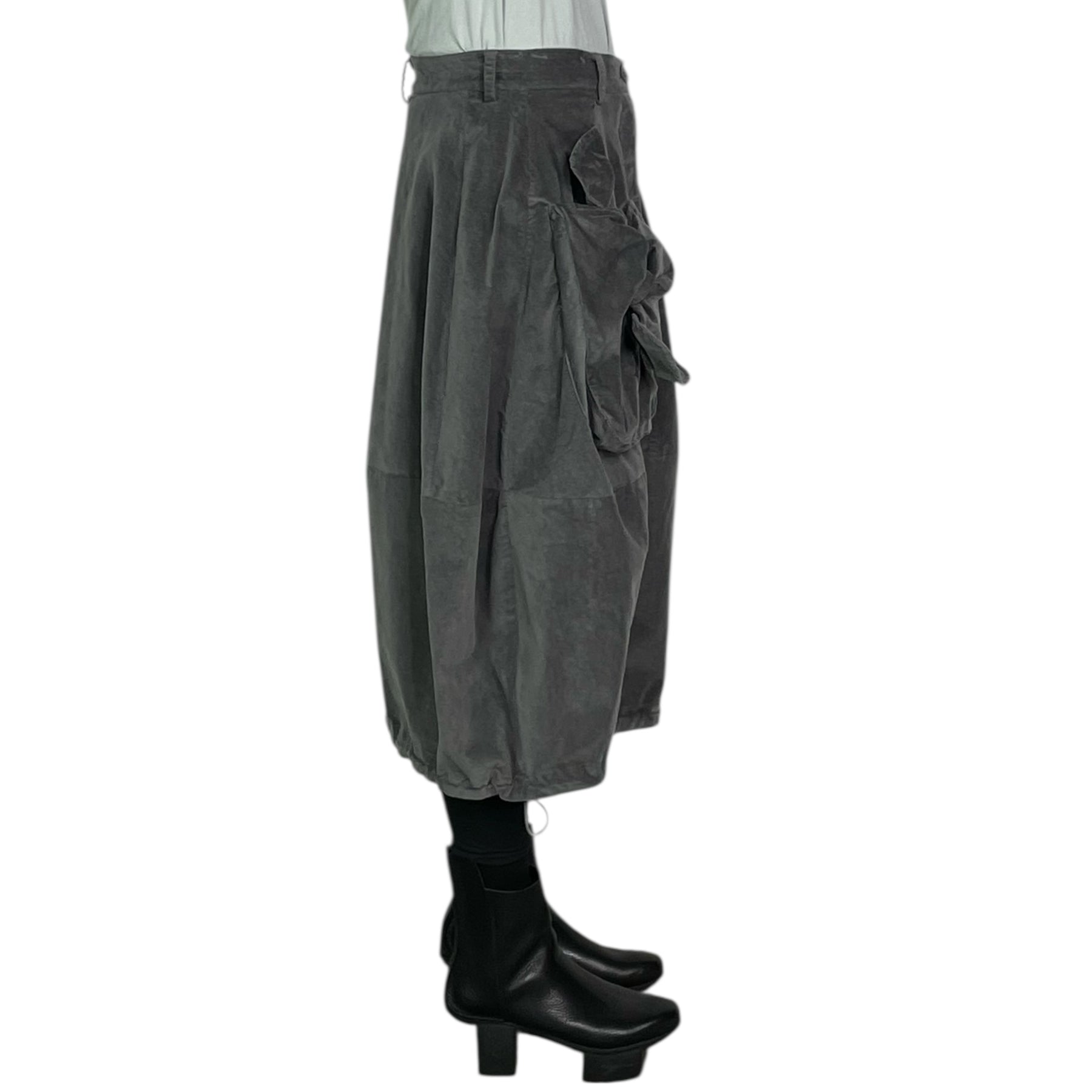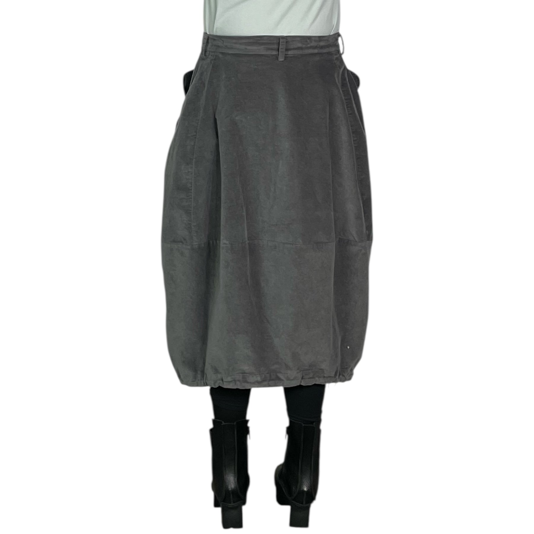 Velveteen tulip shaped skirt with a button fly front and belt loops. Two large front pockets with tie detail, drawcord at hemline for adjustment.