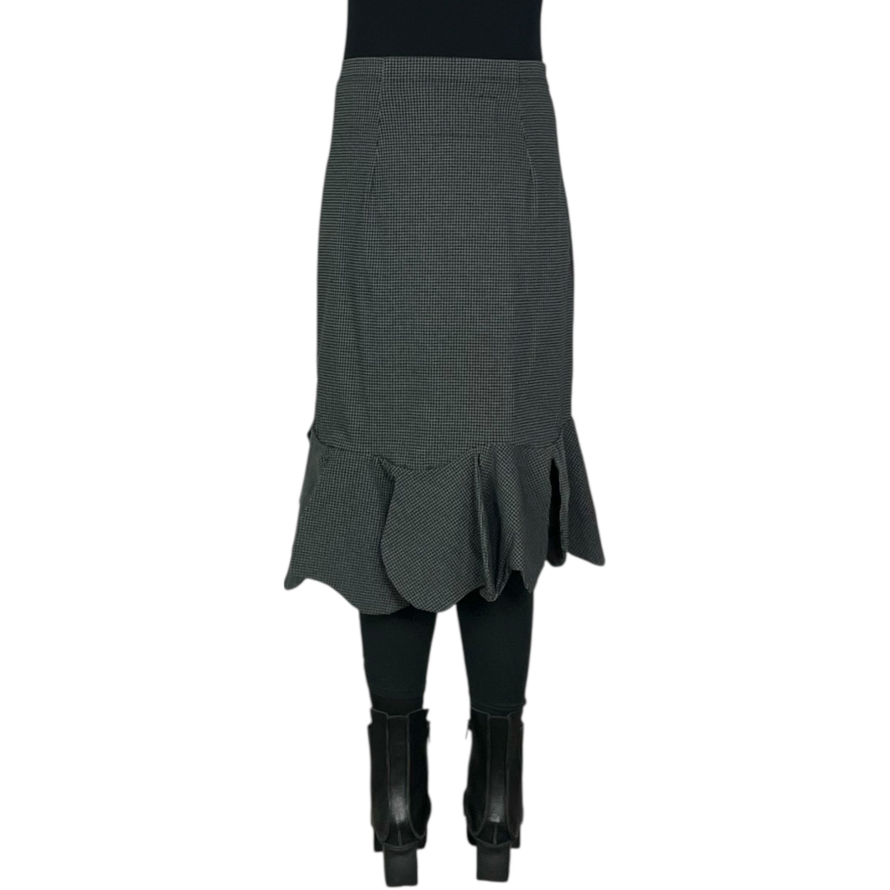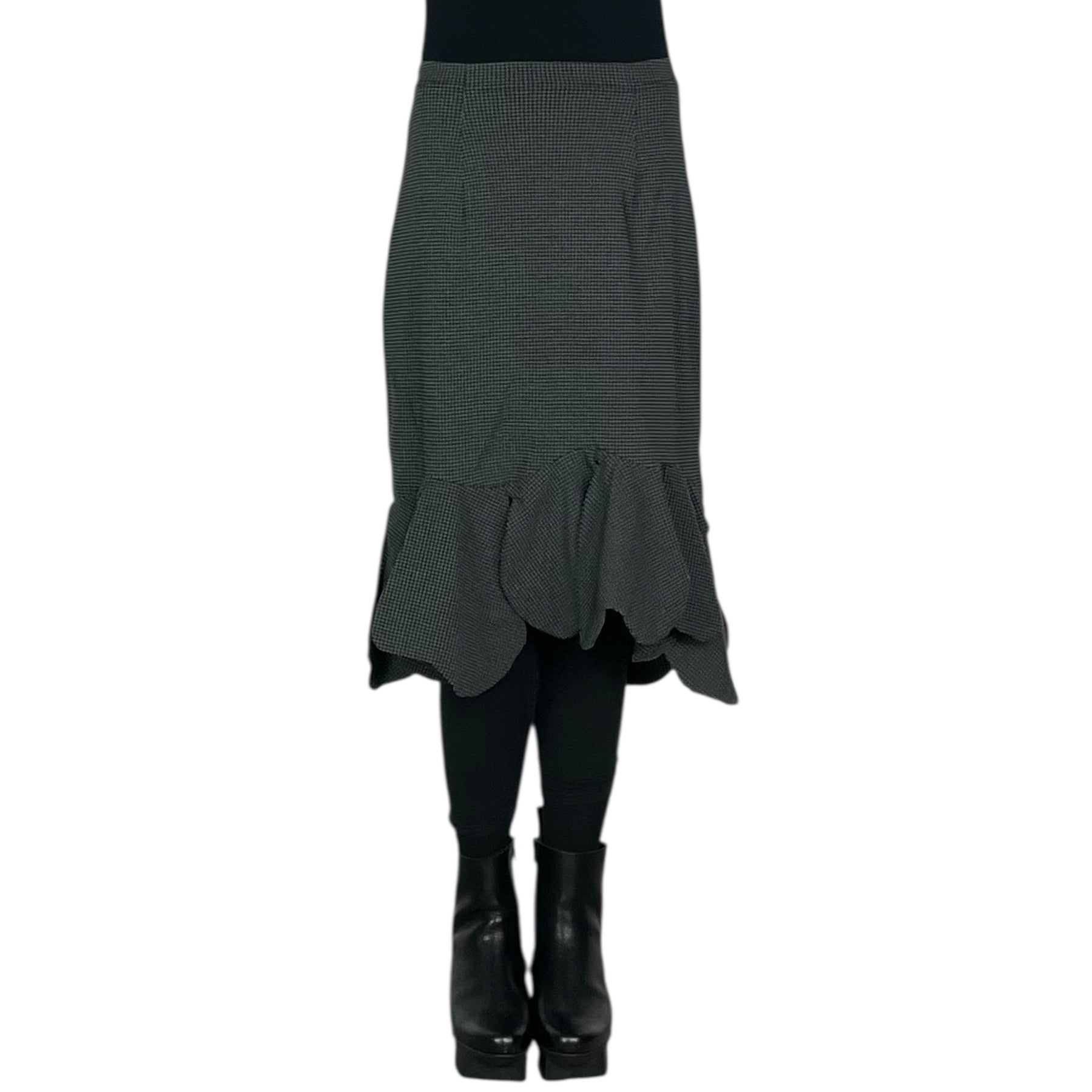Check print slim skirt with an elasticized waistband and petal flounce hemline.