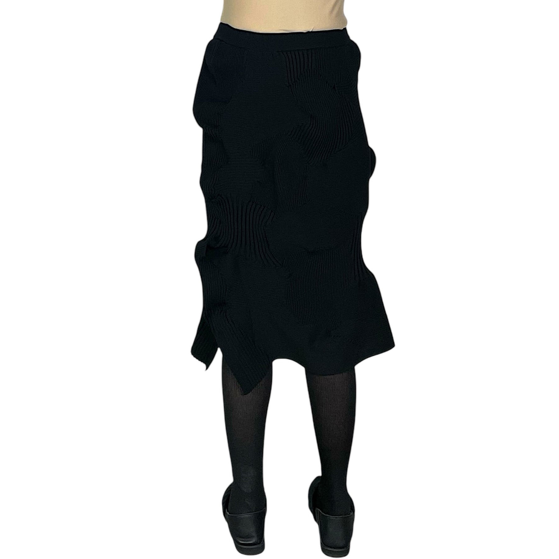 Mid-length pull-on skirt with elasticized waistband and organic shape.